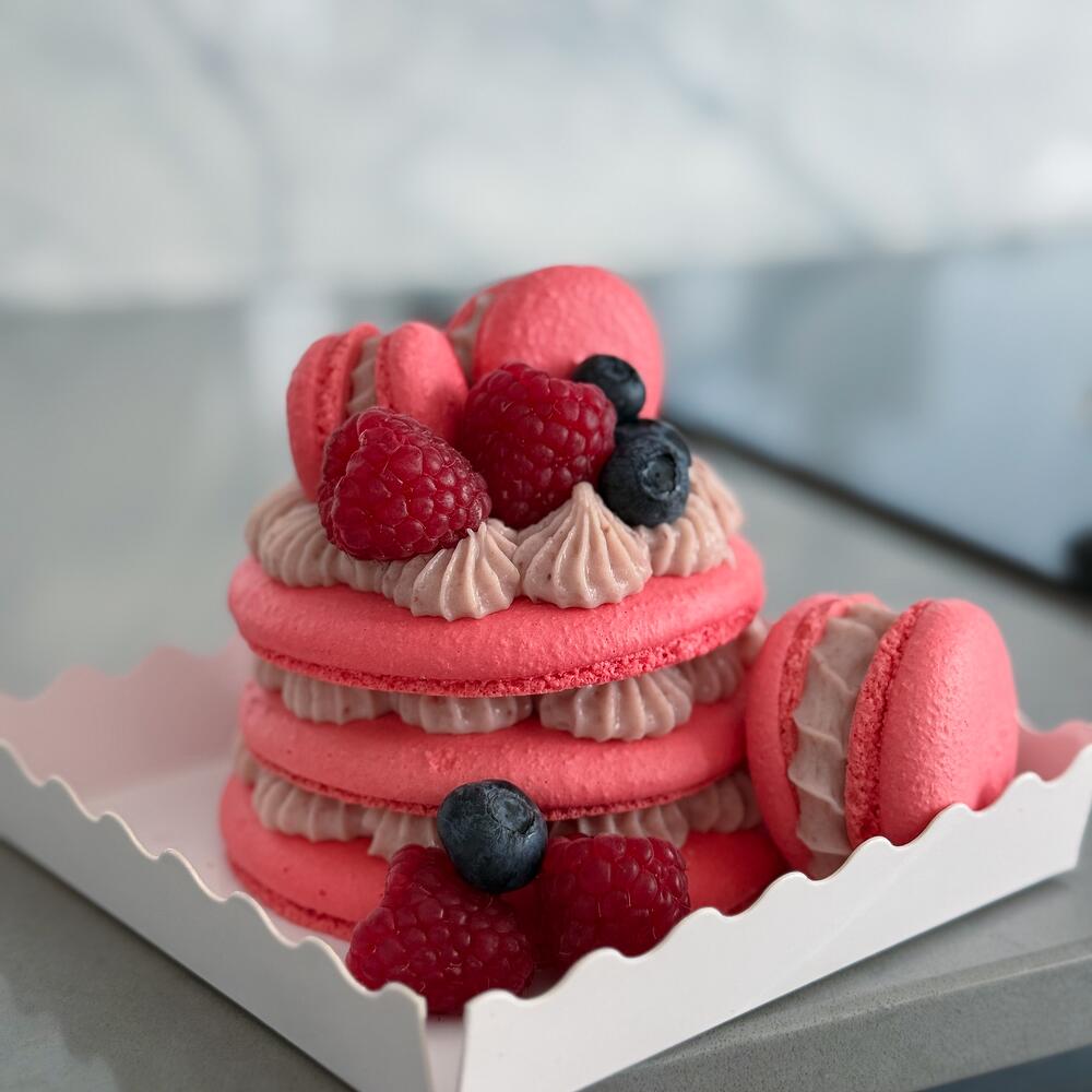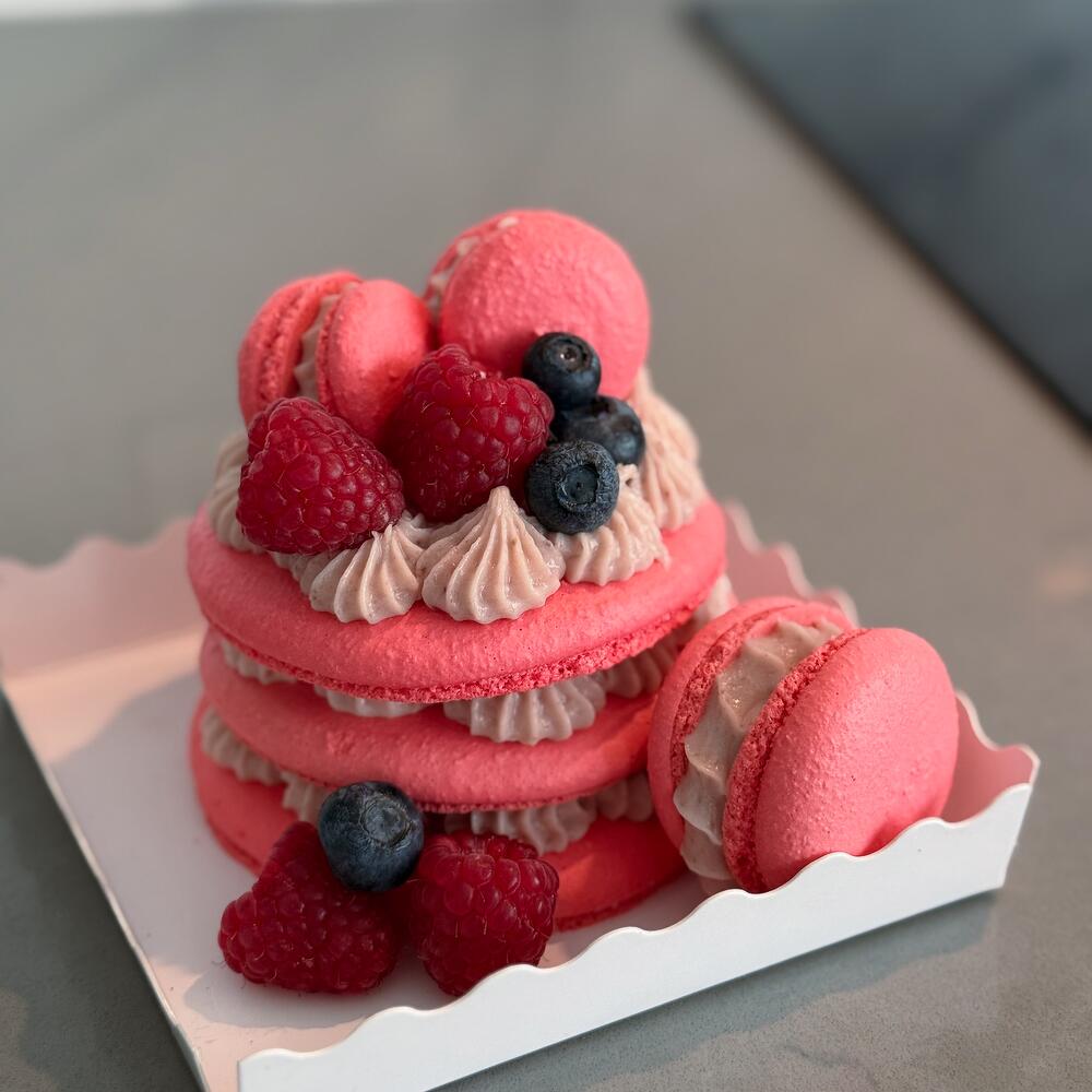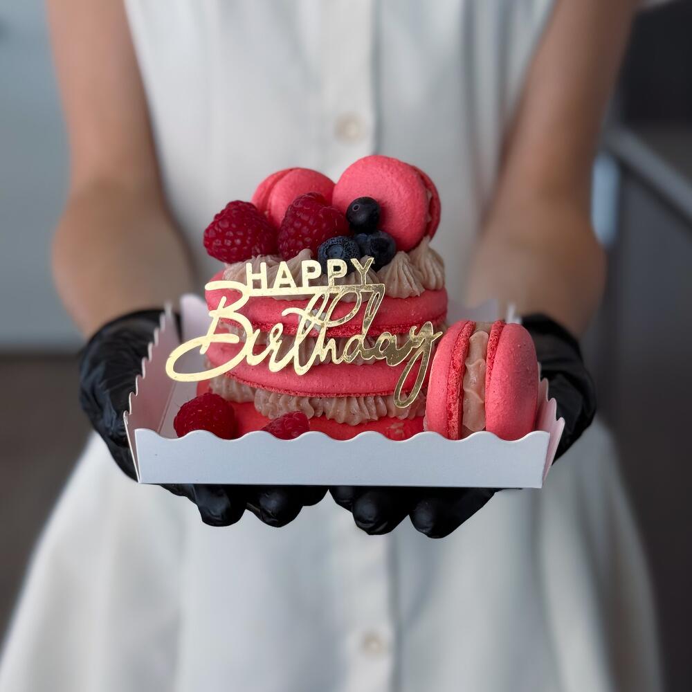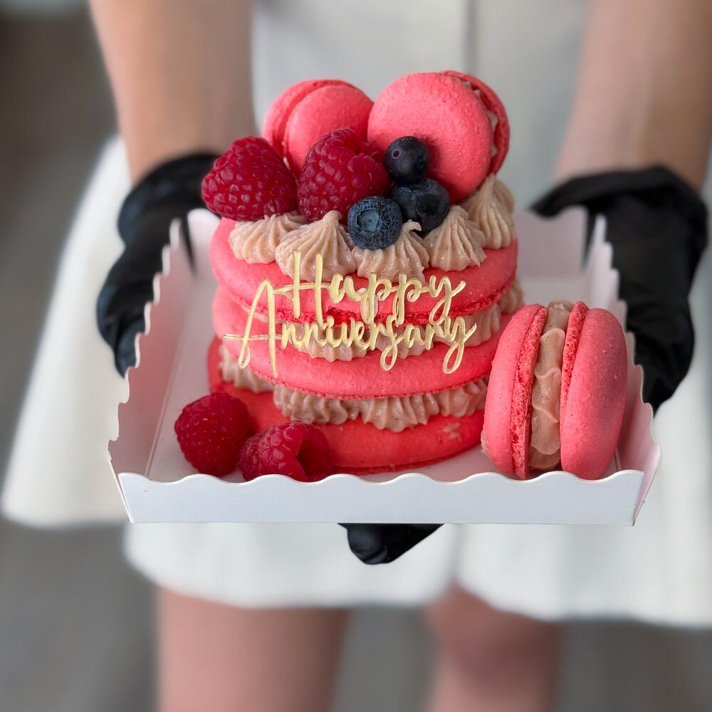 Celebrate Any Special Moment with Our Macaron Cake Make your celebration unforgettable with our handcrafted Macaron Cake – a beautiful and delicious treat for birthdays, anniversaries, or any joyful occasion. This elegant cake features 3 layers (about 5.5 inches in diameter) and is filled with rich ganache made from Belgian chocolate, natural fruit purée or nuts, whipped cream, and butter – ingredients vary depending on the flavour. 🎂 Flavour Colour Options: Choose your favourite from our signature flavours – each one comes with its own unique colour. The cake comes without a topper. If youd like to add a topper, please make a note of what topper you would like, such as a Happy Birthday topper or Happy Anniversary – there’s no additional charge for it. ✨ Extra Touches: Each cake is beautifully decorated with mini macarons in matching colours and seasonal berries (depending on availability). 📩 Want to Customize? If youd like a specific colour or flavour combination, send us a message – we’re happy to create something special just for you!