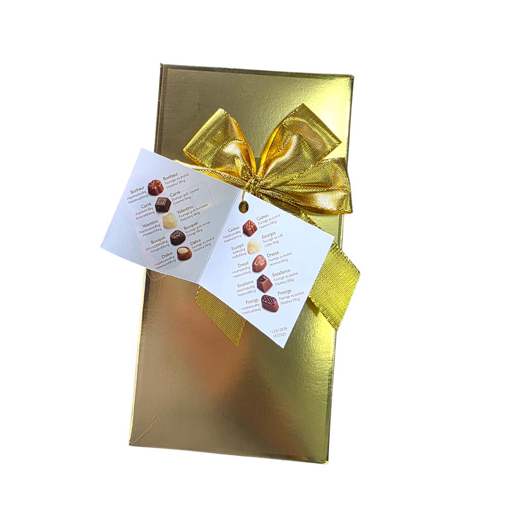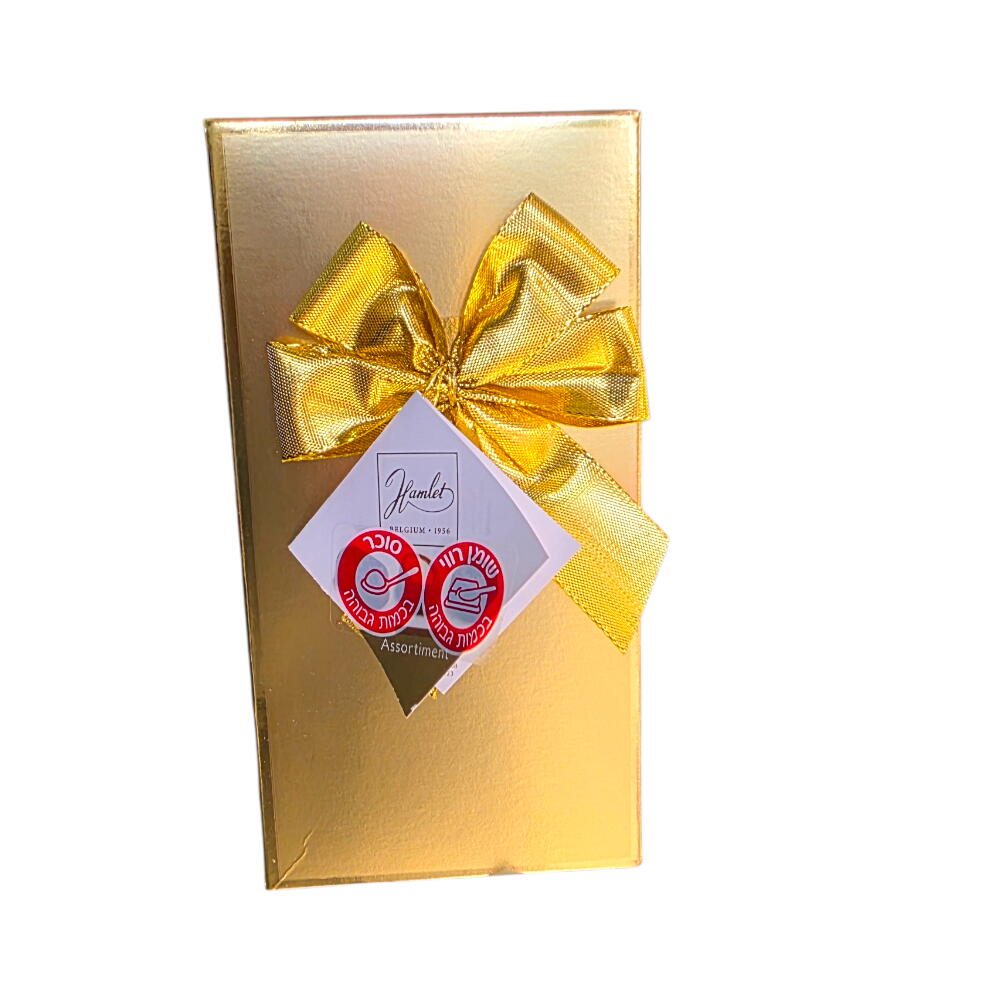 מארז יוקרתי של שוקולד בלגי איכותי מבית Hamlet, עטוף באריזת זהב אלגנטית עם סרט חגיגי. בפנים – מבחר פרלינים ושוקולדים בטעמים קלאסיים, עשויים מחומרי גלם מובחרים, במרקם עשיר וטעם עמוק. מתנה מושלמת ליום האהבה, ימי הולדת, חגים, תודה קטנה או כתוספת יוקרתית לזר פרחים.