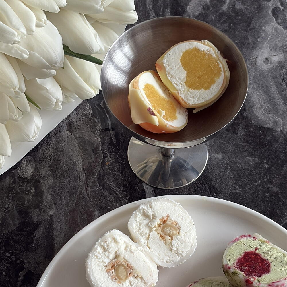 Маскарпоне, сливки 33%, свежие ягоды, пектин NH, белый шоколад, молочный шоколад, сублимированная клубника, матча, ананас, клубника, кокосовые сливки