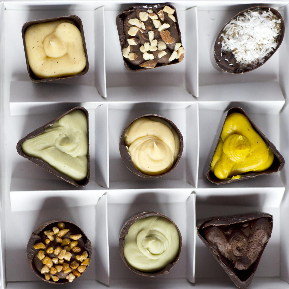 Какао-масло, тертое какао, сухое молоко, сахар, лицитин, сливки, фрукты, чаи, пектин