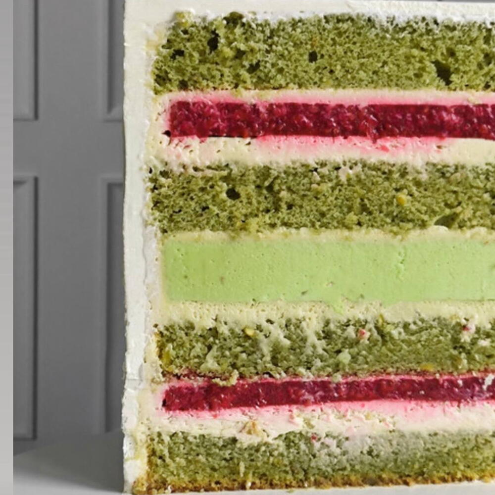Bolo de pistache e framboesa, com camadas delicadas, creme suave e sabor equilibrado entre o doce e o ácido.