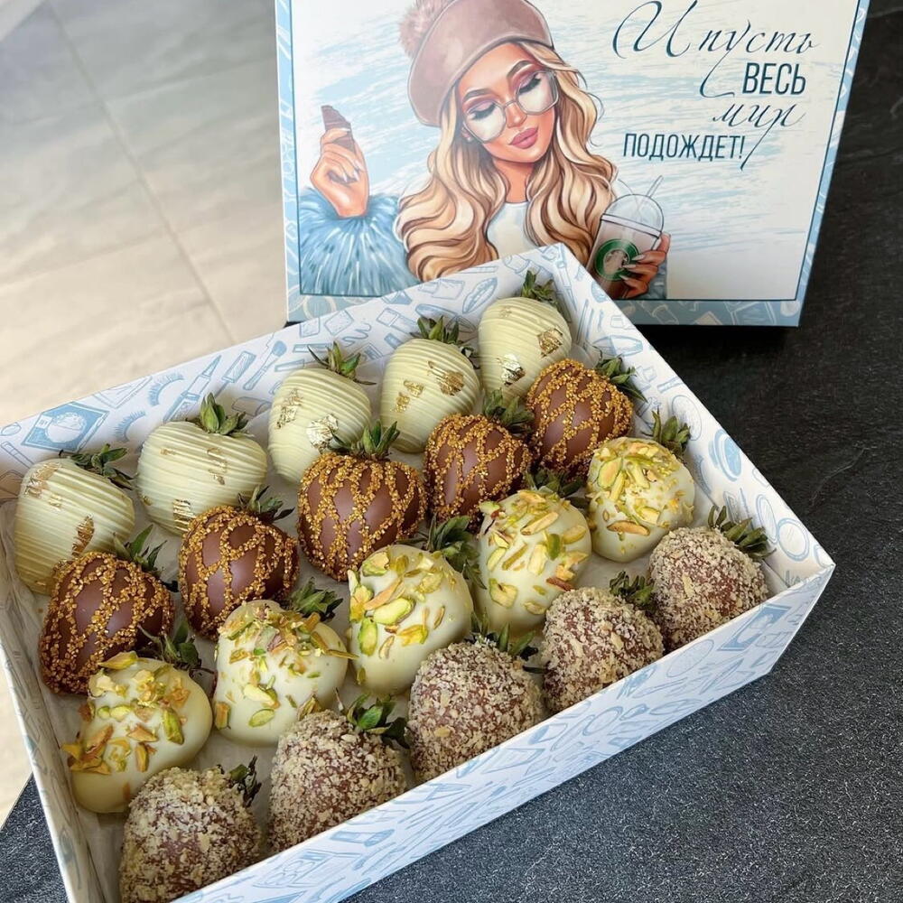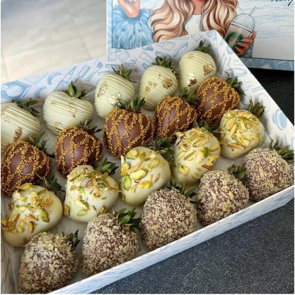 Strawberries in milk chocolate 10 pieces Strawberries in white chocolate 10 pieces Toppings: pistachio, claw gold, confectioners sugar, nut crumbs