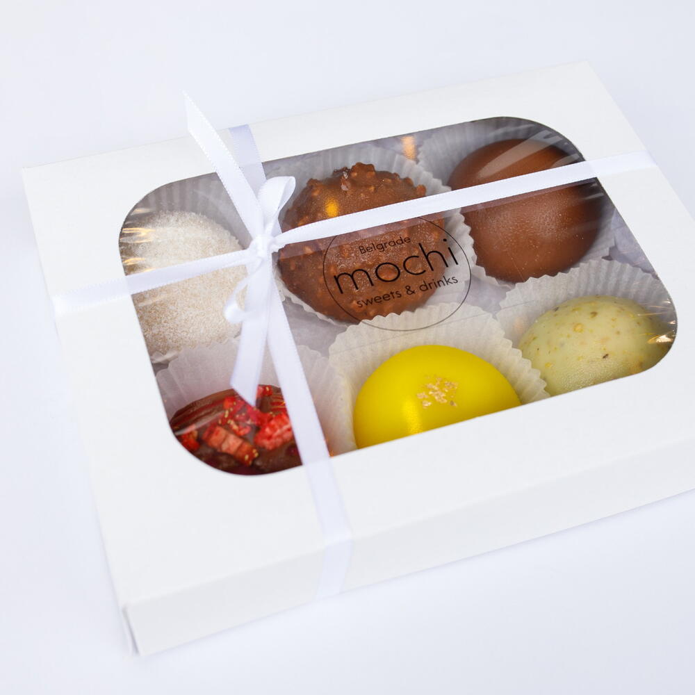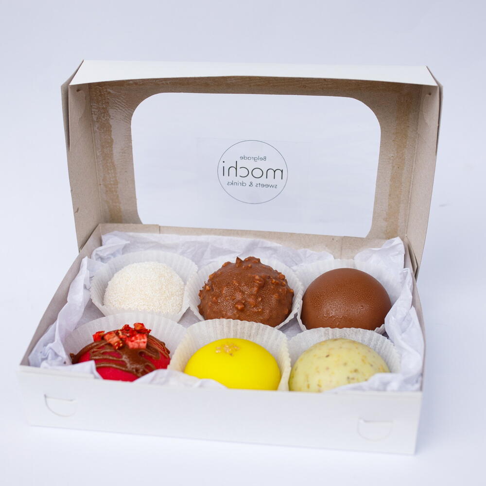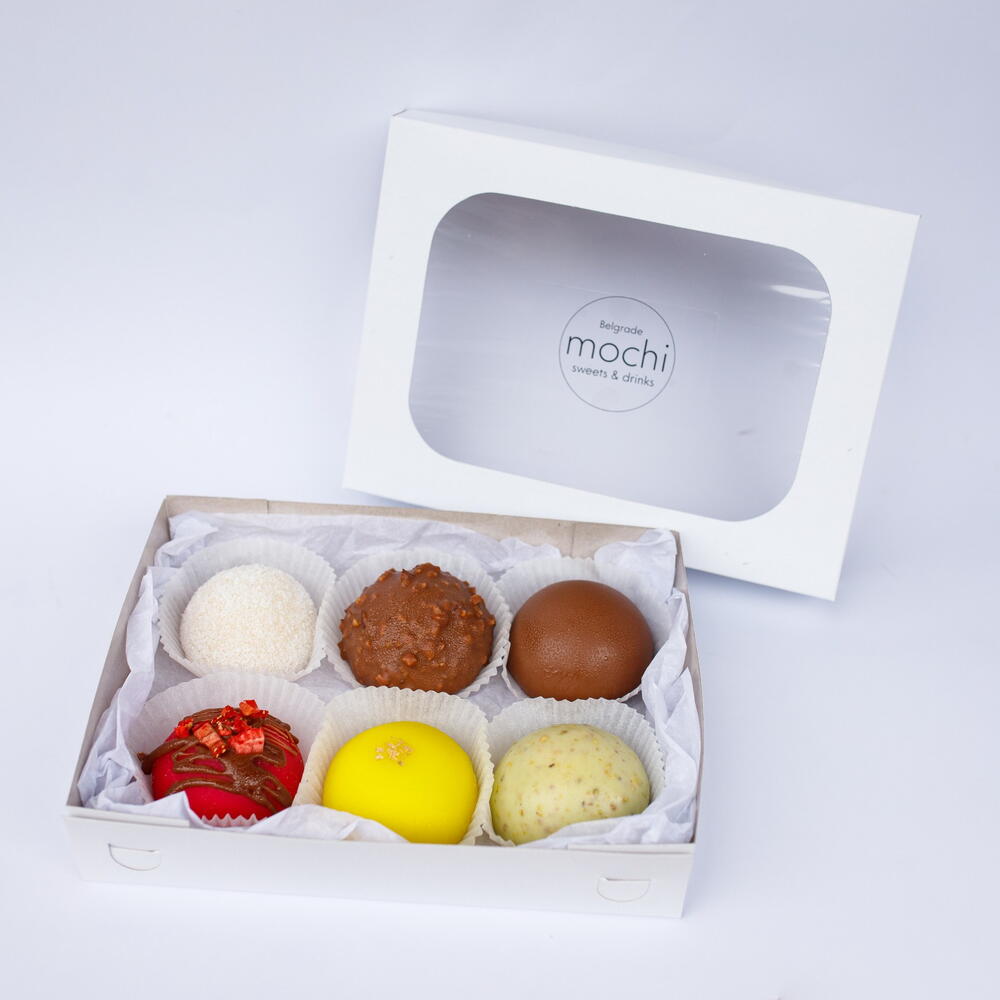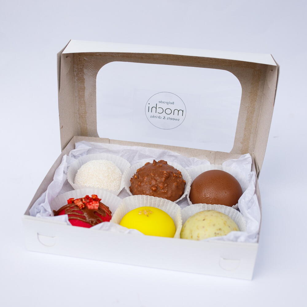 Mochi set Premium of 6 pieces consists of: - STRAWBERRY CHOCOLATE MOCHI - 1 PC - MOCHI PISTACHIO - 1 PC - MOCHI SNICKERS - 1 PC - MOCHI RAFAELLO - 1 PC - MOCHI MANGO PASSIONATE - 1 PC - MOCHI HAZELNUT - 1 PC - GIFT BOX AND DECORATIONS * In this set, mochi can be replaced if one of the flavors is missing All mochi are gluten, egg and gelatin free.