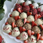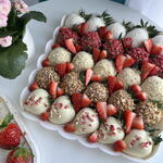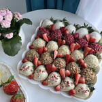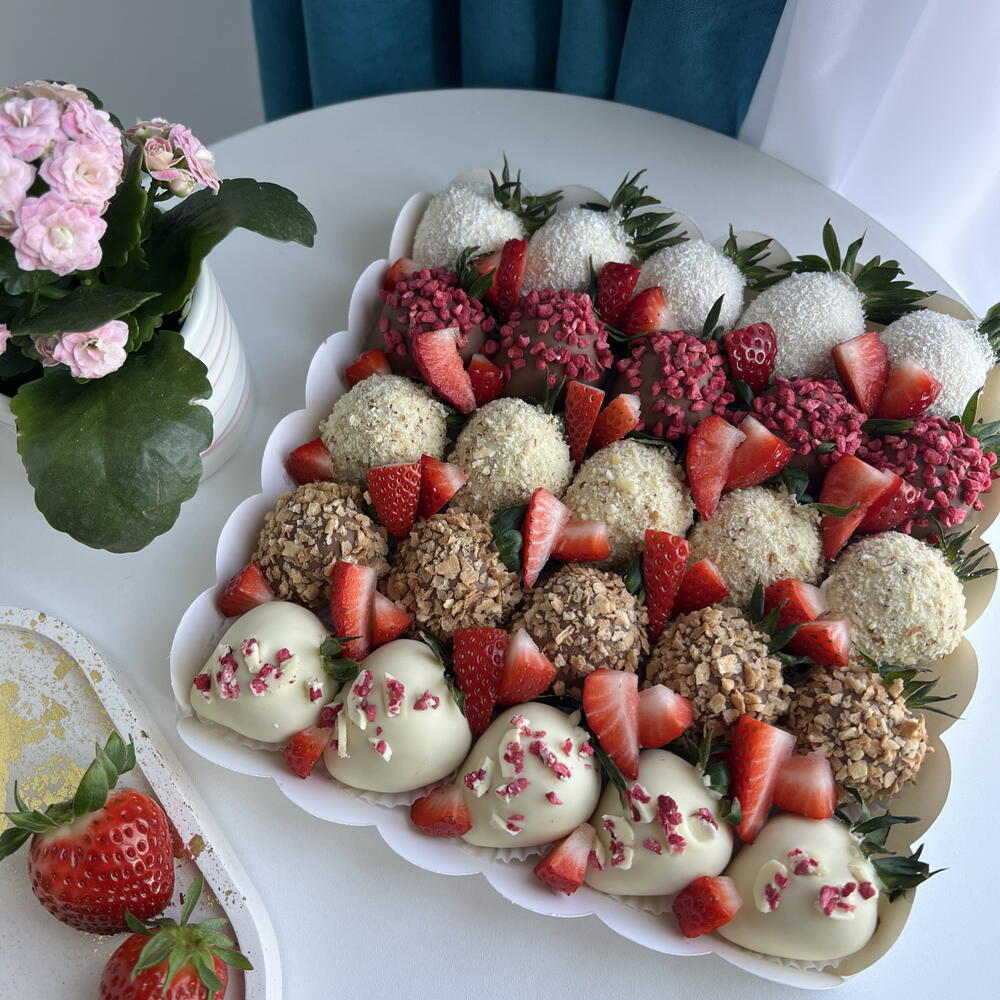 Strawberries in milk chocolate 10 pieces Strawberries in white chocolate 15 pieces Toppings: coconut chips, freeze-dried raspberries, nut crumbs, waffle crumbs, strawberries in yogurt. A white box with a transparent lid.