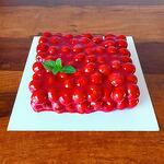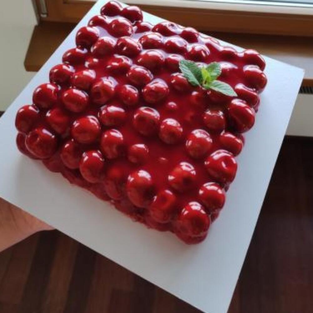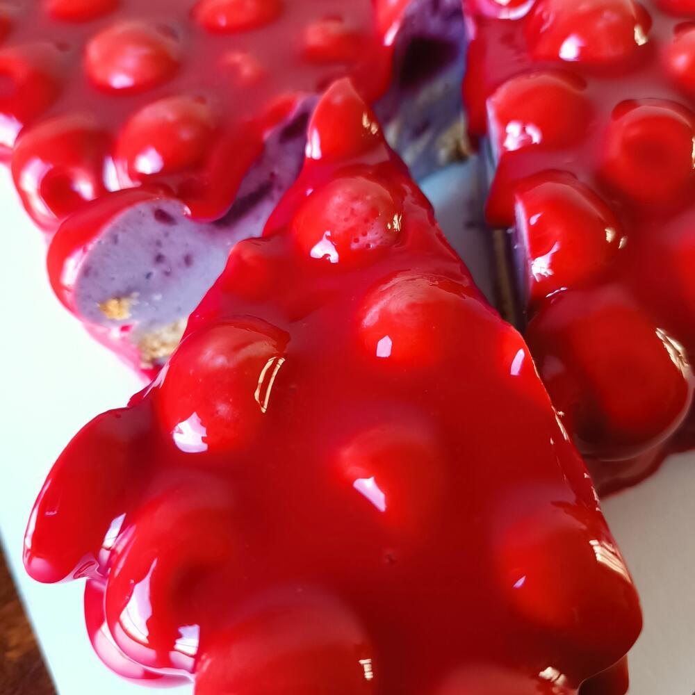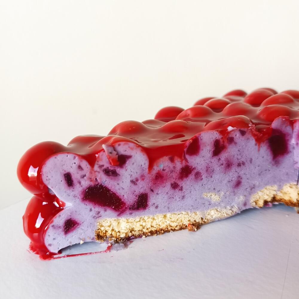 Ingredients: cream 30%, gelatin, mascarpone, blueberry, cherry, white chocolate, red food coloring