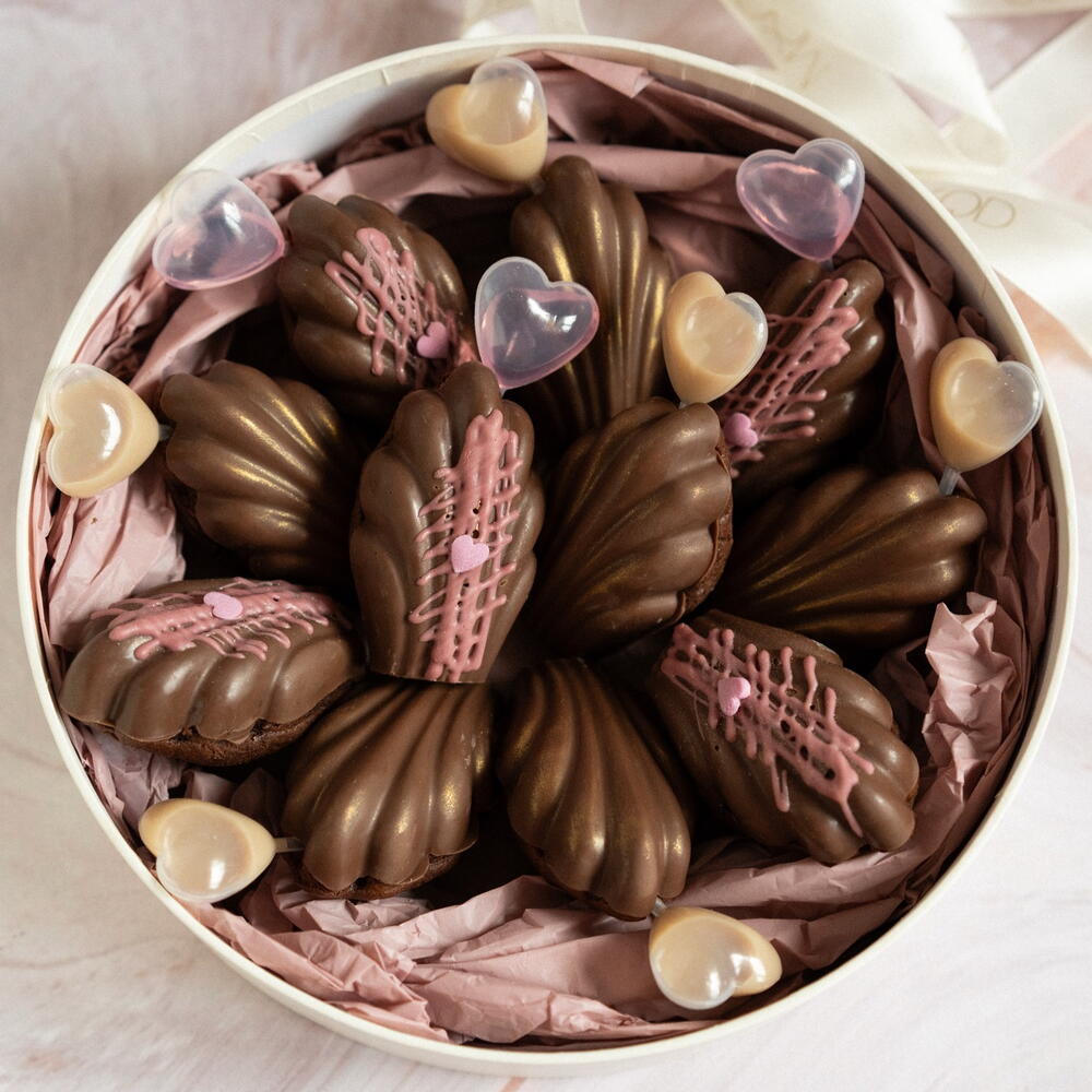 An elegant French classic with a modern twist. Soft madeleines with coffee Baileys / Rose syrup infusion, assorted fillings, and Swiss chocolate coating. Presented in an elegant gift box, the set contains 11 pieces.
