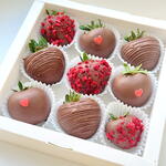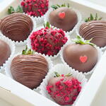 Strawberries in chocolate hearts and red