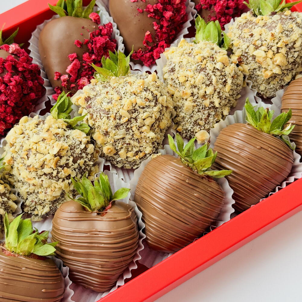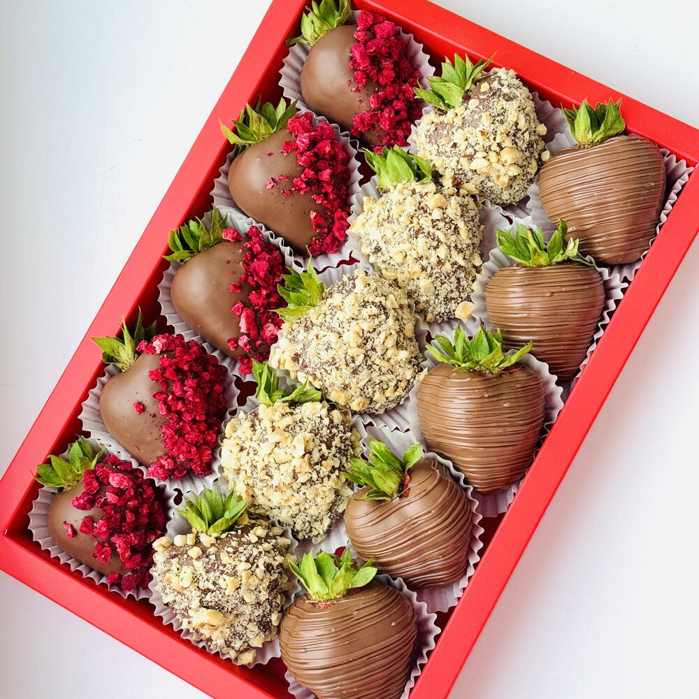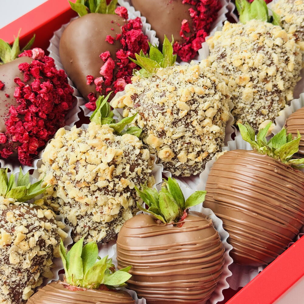 A delicious box of fresh strawberries dipped in smooth milk chocolate, topped with crunchy nuts and vibrant raspberry pieces. A perfect balance of sweetness, freshness, and texture in every bite. 🍓🍫✨