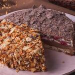 Свежий торт из локальной кондитерской с прослойкой из слоенных коржей и шоколадным коржом.