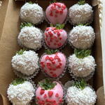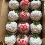 Strawberries,milk chocolate,white chocolate,coconut flakes