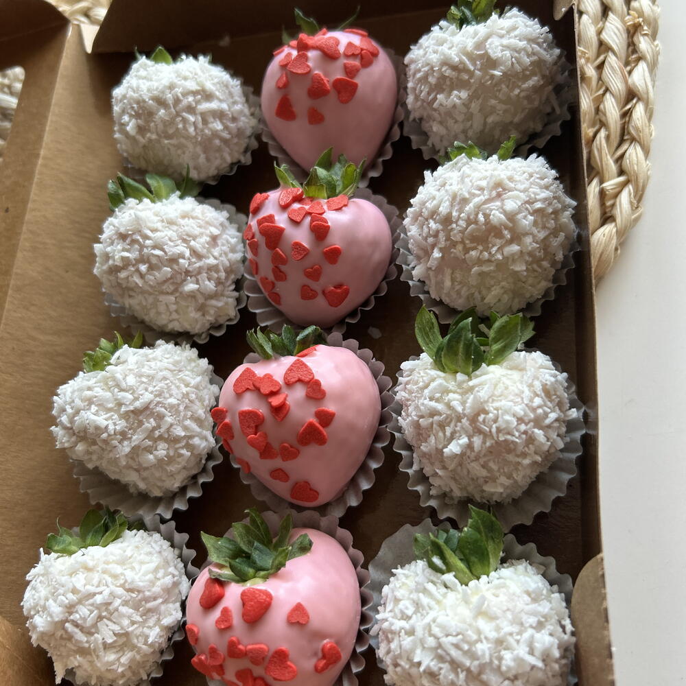 Strawberries,milk chocolate,white chocolate,coconut flakes