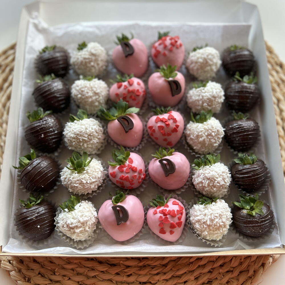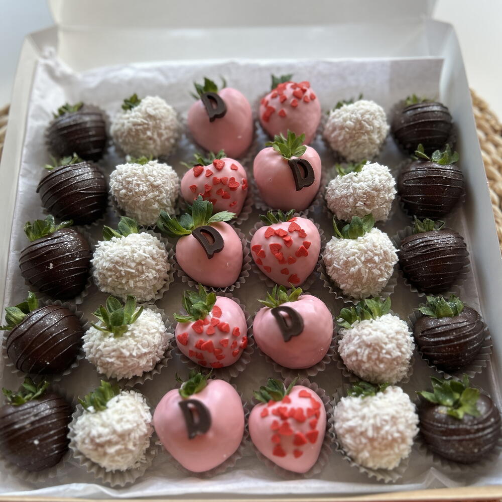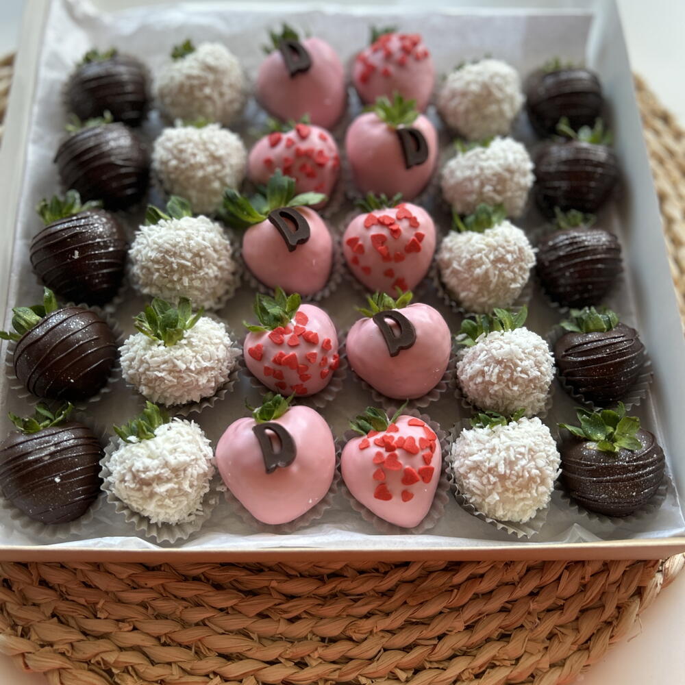 Strawberries,milk chocolate,white chocolate,coconut flakes