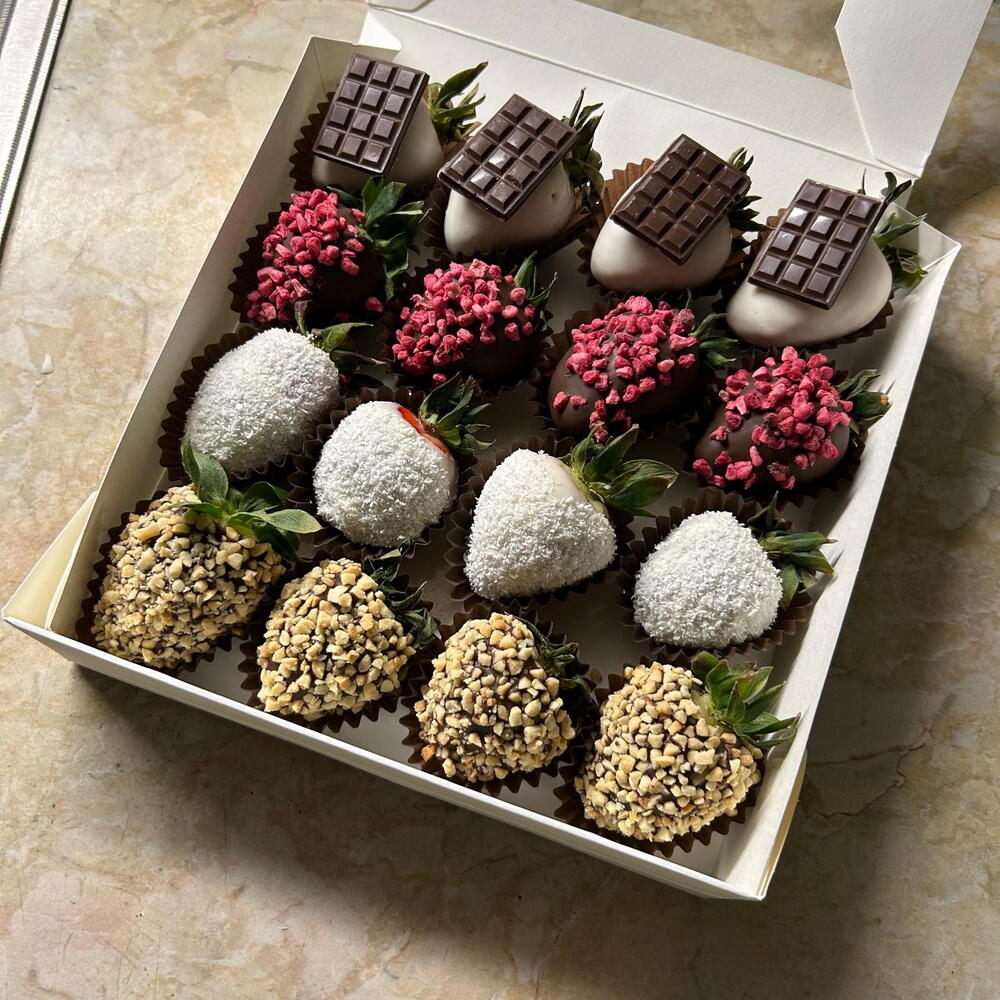 Belgian milk chocolate, white milk chocolate, fresh strawberries, chocolate sprinkles, nuts, coconut, freeze-dried raspberries.