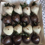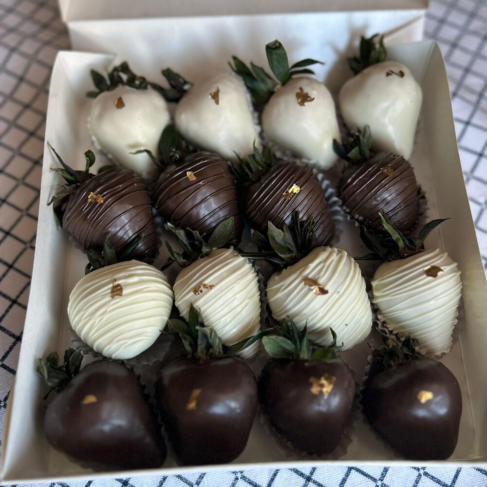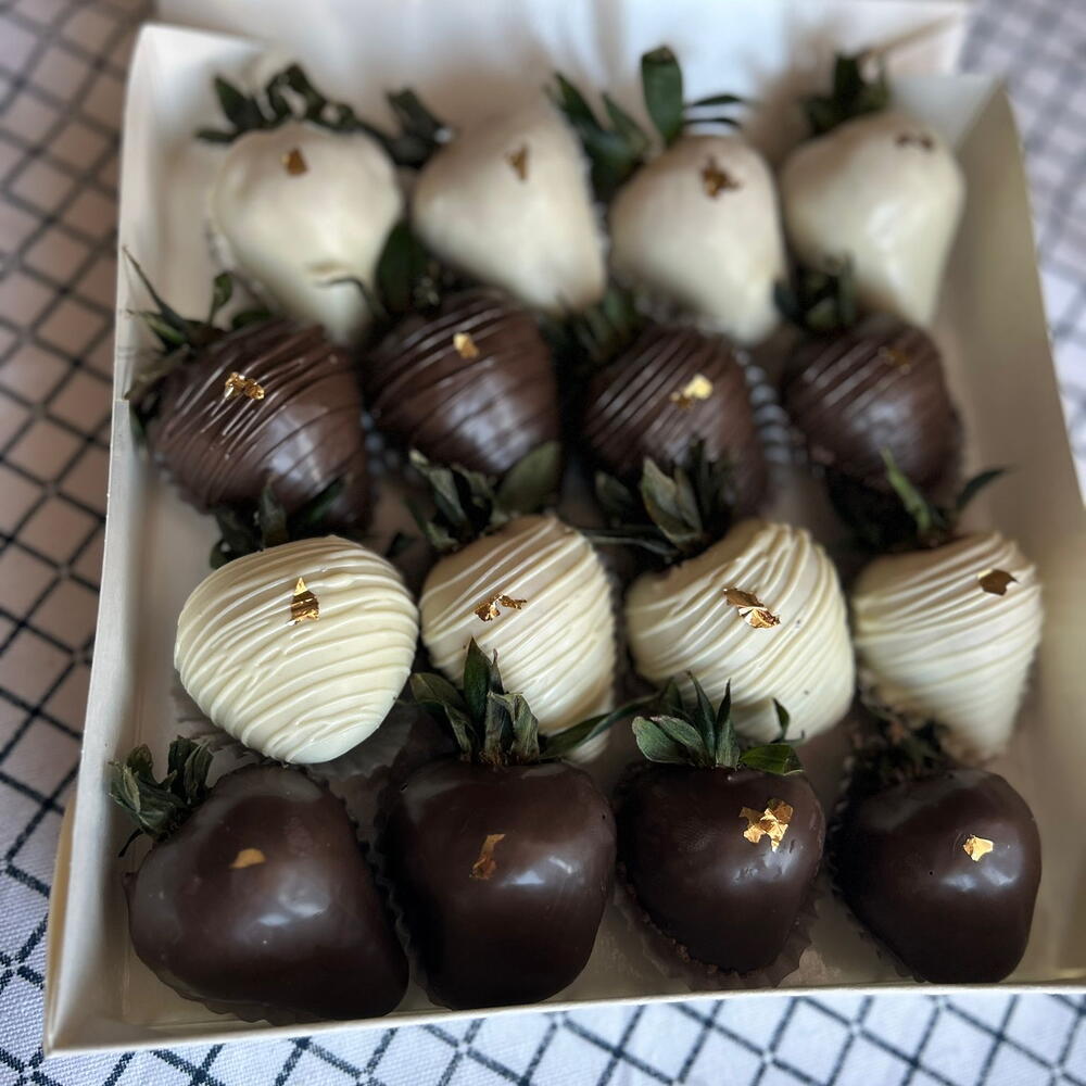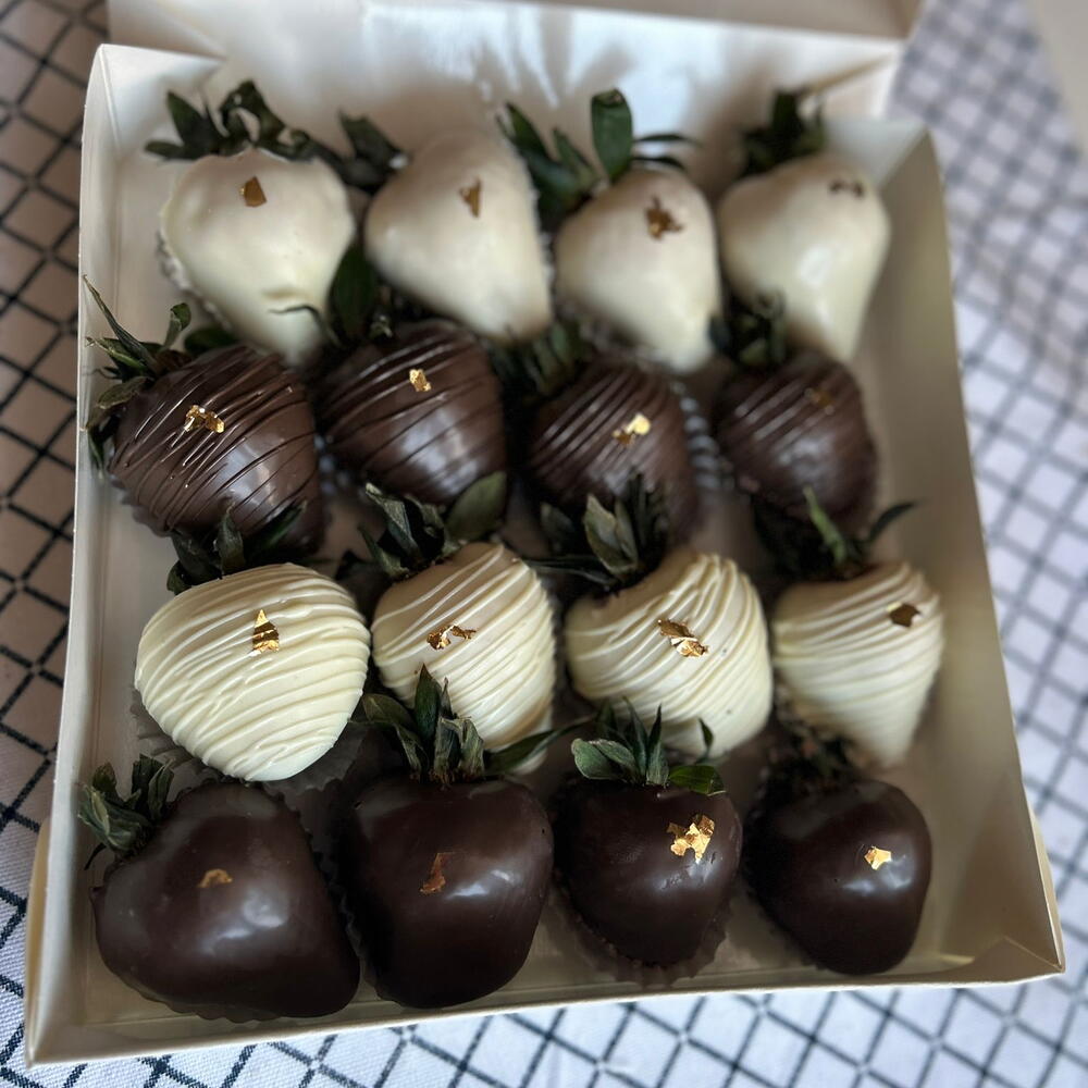 White Belgian chocolate 33%, milk Belgian chocolate 56%, fresh strawberries, sprinkles.