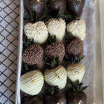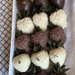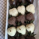 White Belgian chocolate 33%,Belgian milk chocolate 56%,fresh strawberries, sprinkles