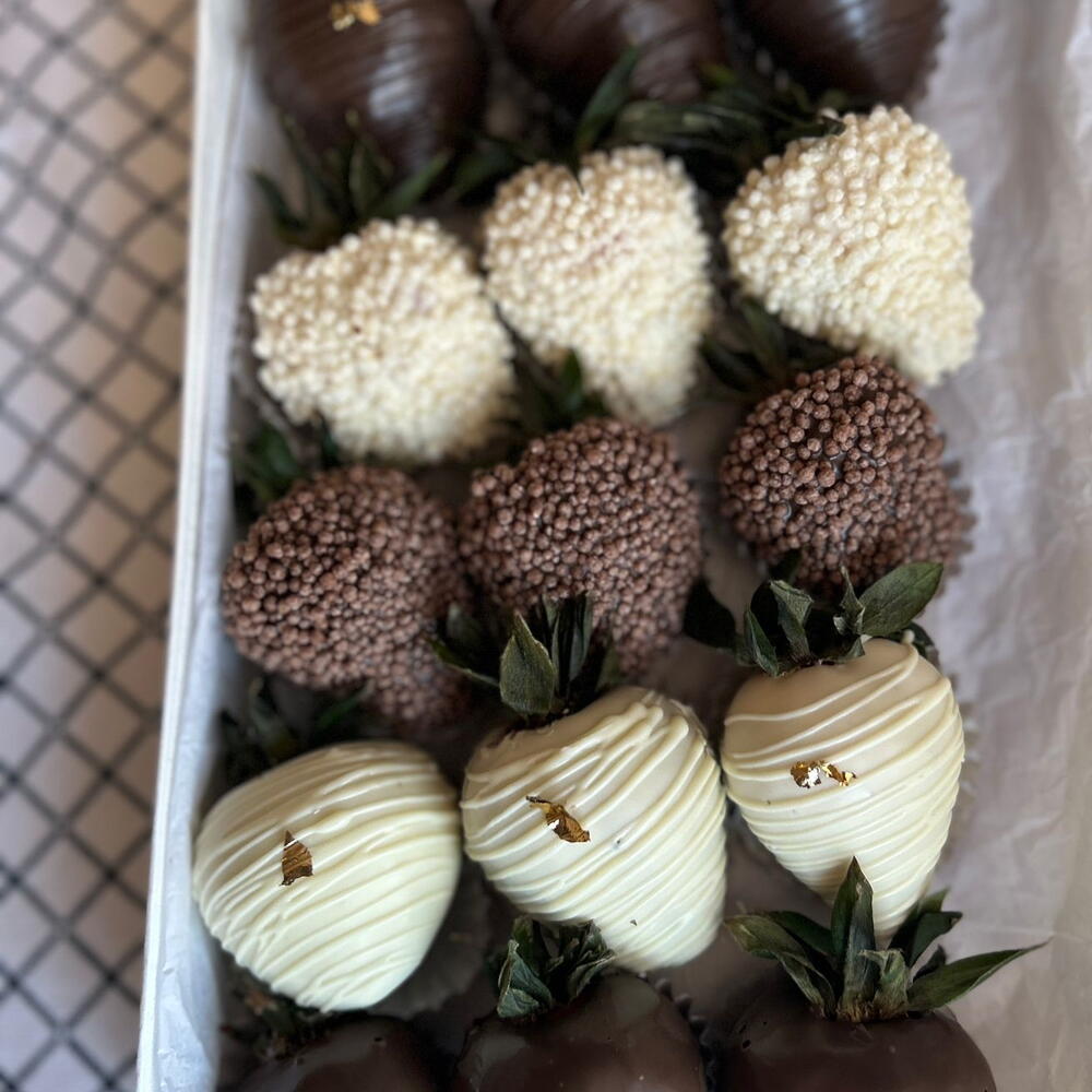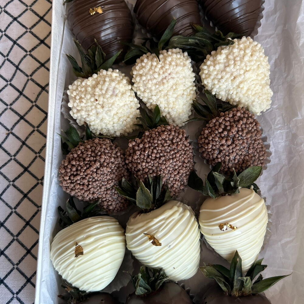 White Belgian chocolate 33%,Belgian milk chocolate 56%,fresh strawberries, sprinkles