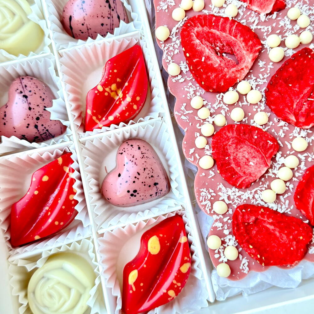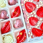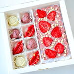 An elegant box of handcrafted chocolate sweets decorated with strawberries and delicate chocolate accents. Made with high-quality chocolate and carefully designed details. A perfect sweet gift for chocolate and berry lovers.