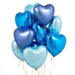 12 balloon hearts inflated with helium. Assembled into balloon bouquet and attached to the weight. Color scheme : blue, light blue , satin blue