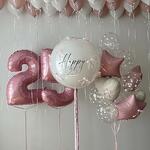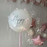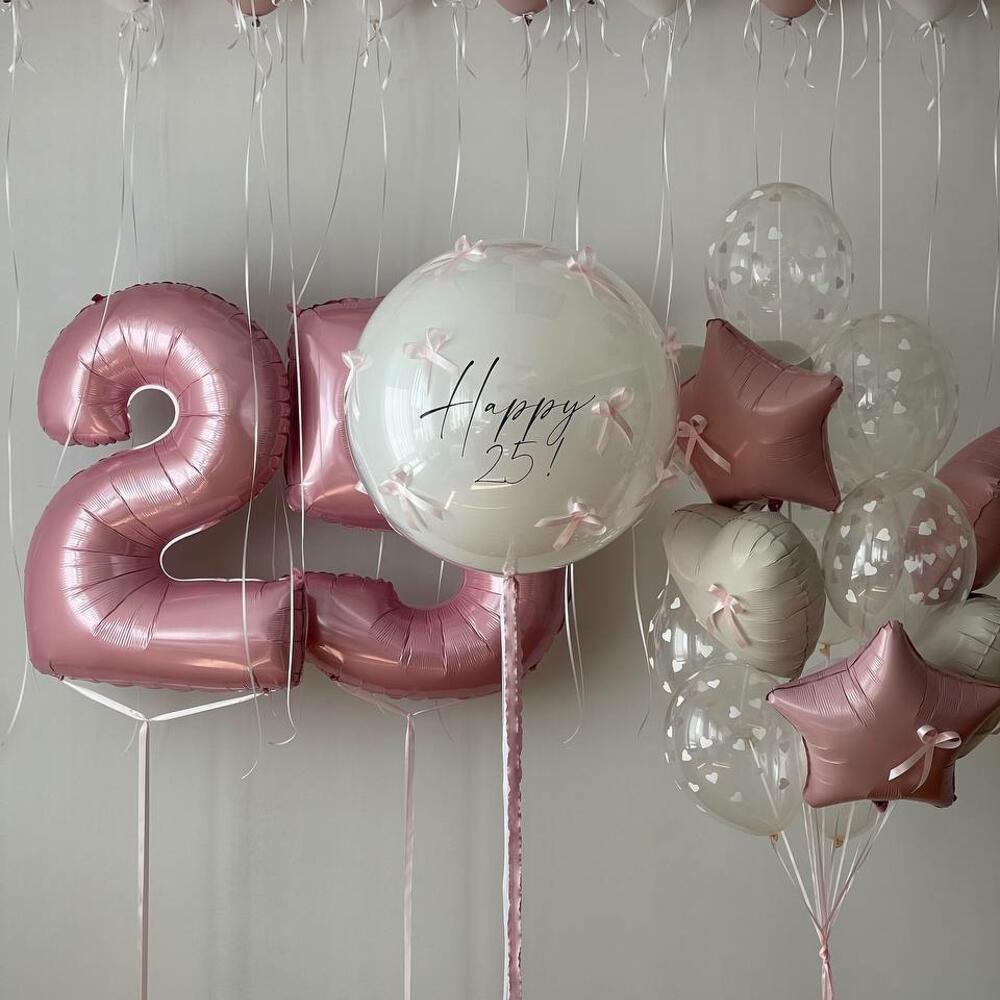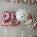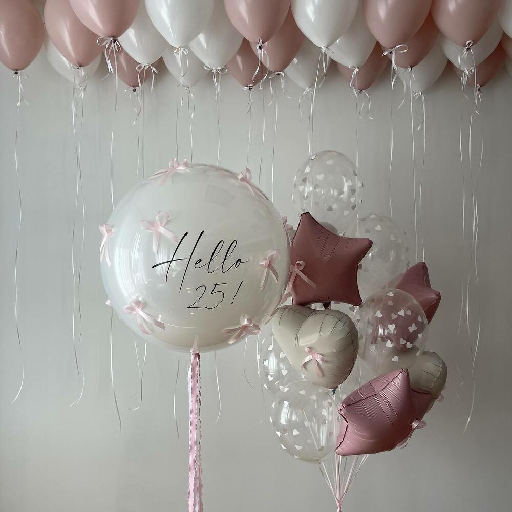 Set contents: - Big Balloon “Bubbles” (60 cm) with bows and personalized inscription; - A set of foil and latex balloons of standard size -10 pcs; - The big balloon is “The Number” -2 pcs; - 12 latex balloons under the ceiling. *The inscription on the big balloon can be any (no more than 5 words). Specify it in the comments to the order. **Colors of balloon composition can be chosen. Write your wishes on colors when placing an order.