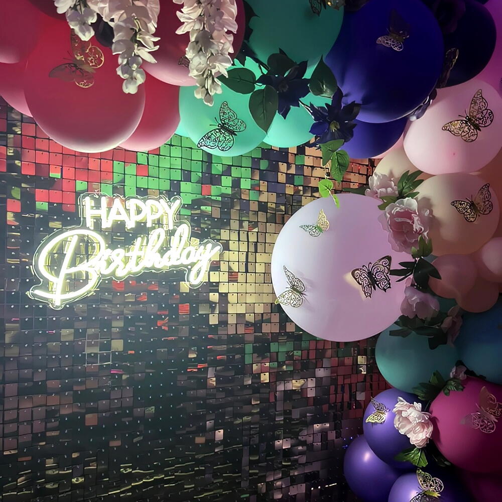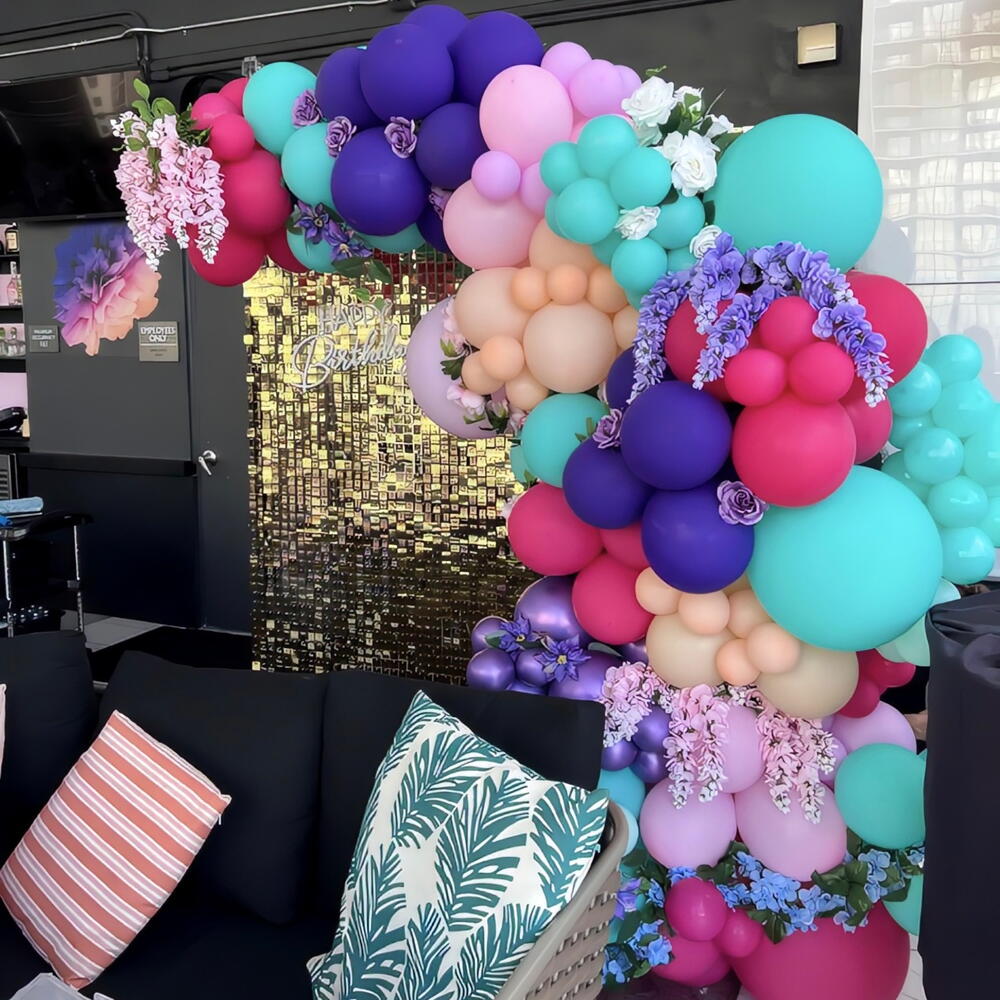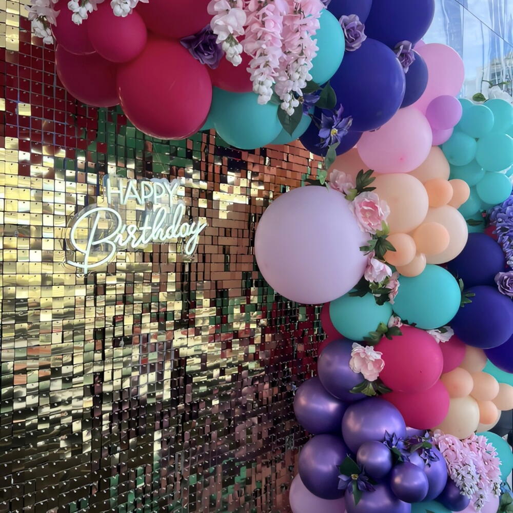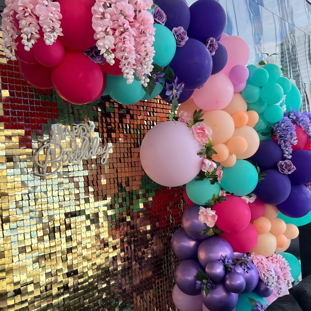Balloons garland with shiny wall and flowers, butterflies decorate plus text «Happy birthday» Tiffany, purple, pink, orange colours