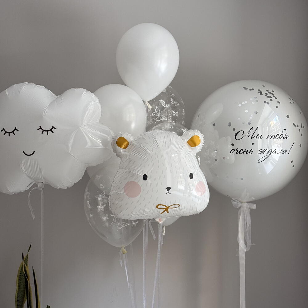 Included in the set: 1 figure: bear 1 figure: cloud 1 crystal balloon 70cm with a custom inscription and confetti 1 bundle of 7 balloons ( 3 balloons 30cm with confetti, 4 balloons 30cm pastel) 4 weights 2 bags for transportation Total number of balloons: 10 Filling: All balloons are filled with helium. длина, мм: 2000 ширина, мм: 2000 высота, мм: 2000