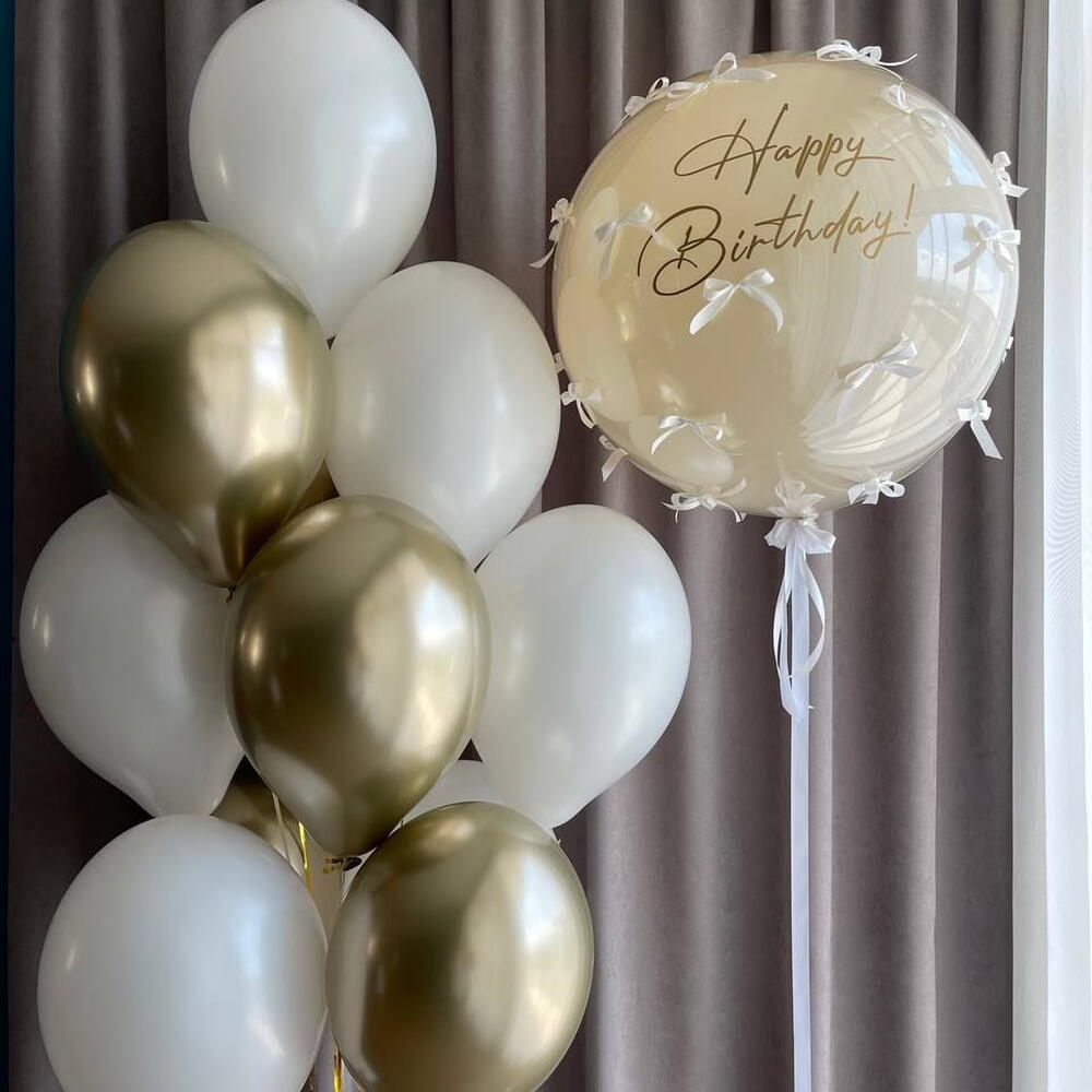 Included in the set: 1 crystal ball 70cm with custom inscription and bows 1 cluster of 12 balloons ( 7 balloons 30cm pastel, 5 balloons 30cm chrome) 2 weights 2 bags for transportation Total number of balloons: 13 Filling: All balloons with helium длина, мм: 2000 ширина, мм: 2000 высота, мм: 2000