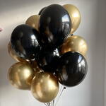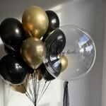 Стилен комплект в черно и злато — ефектен, елегантен и перфектен акцент за рожден ден. Включва: • прозрачна сфера с персонализация (надписът може да бъде променен) • във вътрешността може да се добавят пера, мини балони или цветя — просто ни пишете • букет от 16 балона в черно-златна гама (8 черни и 8 златни) Ако искате да промените размера, състава или да добавите детайли — пишете ни и ще създадем всичко по ваш вкус 💫
