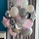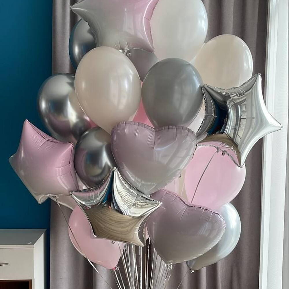 Included in the set: 1 cluster of 30 balloons (5 stars 45cm, 3 hearts 45cm, 8 balloons 30cm chrome , 14 balloons 30cm pastel ) 1 weight 2 bags for transportation Total number of balloons: 30 All balloons filled with helium. длина, мм: 2000 ширина, мм: 2000 высота, мм: 2000