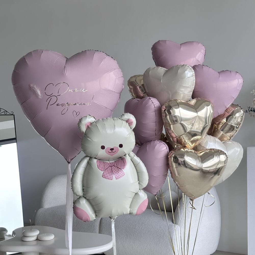 Set contents: - Large foil balloon Heart with an personalized inscription; - The big thematic balloon is “Teddy Bear” - Fountain of foil hearts of standard size 12 pcs. *The inscription on the big balloon can be any (not more than 5 words). Specify it in comments to the order. It is also possible to place up to four photos on a large Heart. **Colors of balloon composition can be chosen. Write your wishes on colors when placing an order.