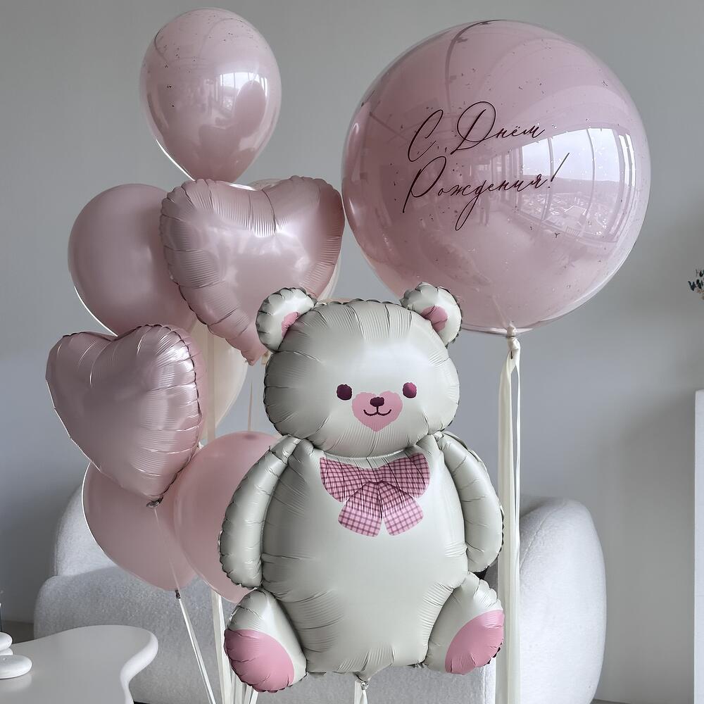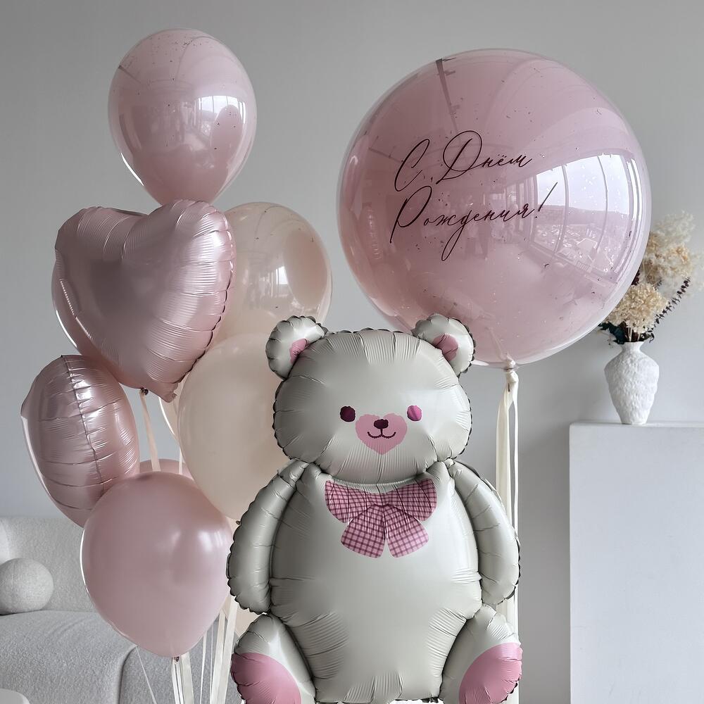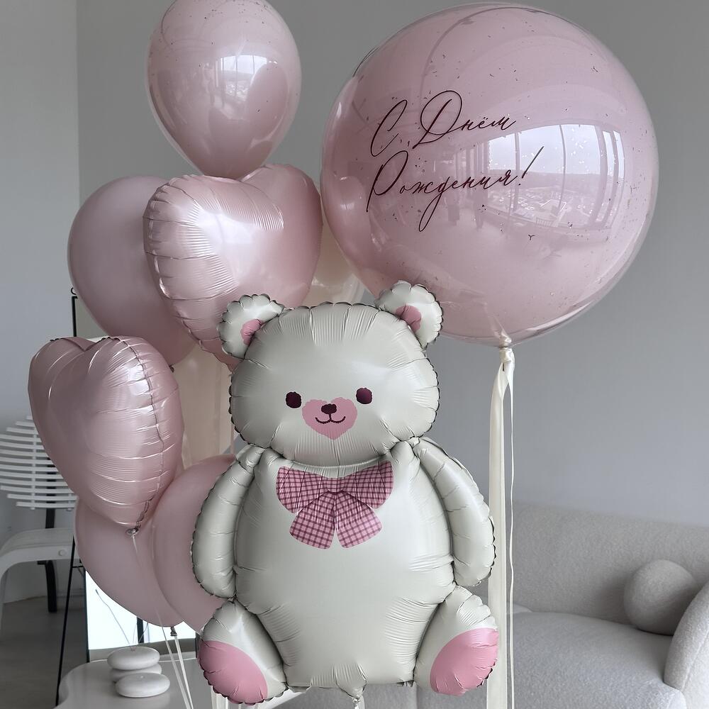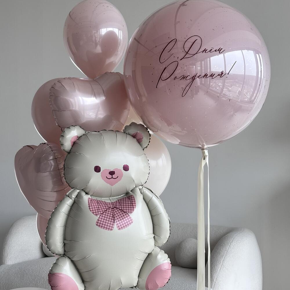 Set contents: - Large Bubbles balloon (60 cm) with an personalized inscription; - The big thematic balloon is “Teddy Bear” - Fountain of foil hearts and latex balloons of standard size 8 pcs. *The inscription on the big balloon can be any (not more than 5 words). Specify it in comments to the order. **Colors of balloon composition can be chosen. Write your wishes on colors when placing an order.