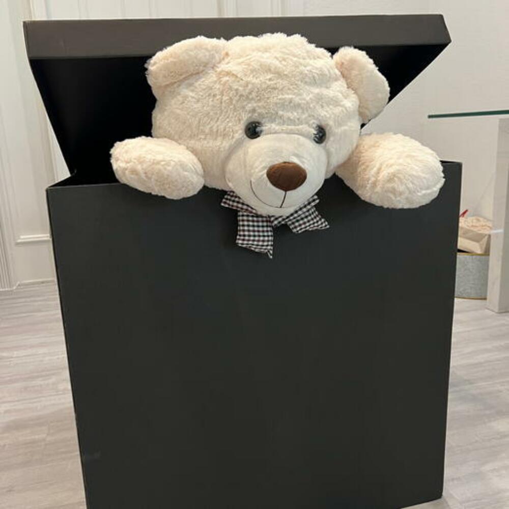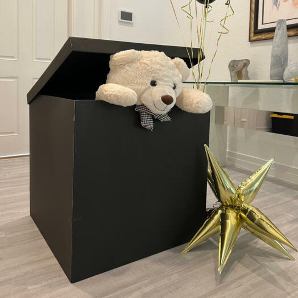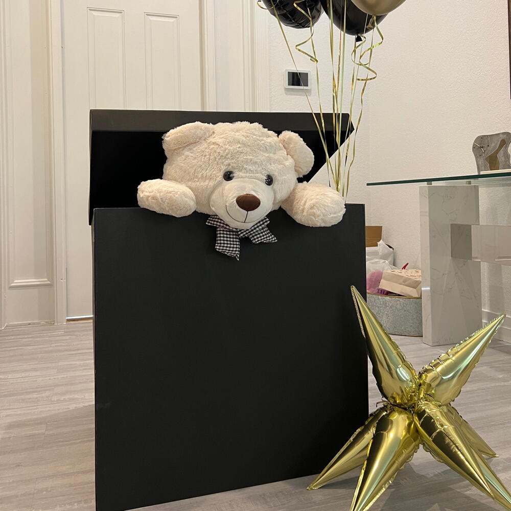 Size 70*70*70 inches, black color with big giant white bear ( size 47 inch), with 8 balloons inside the box