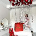 red color, size is 70*70*70 , including 10-12 helium balloons of your choice, bow and text