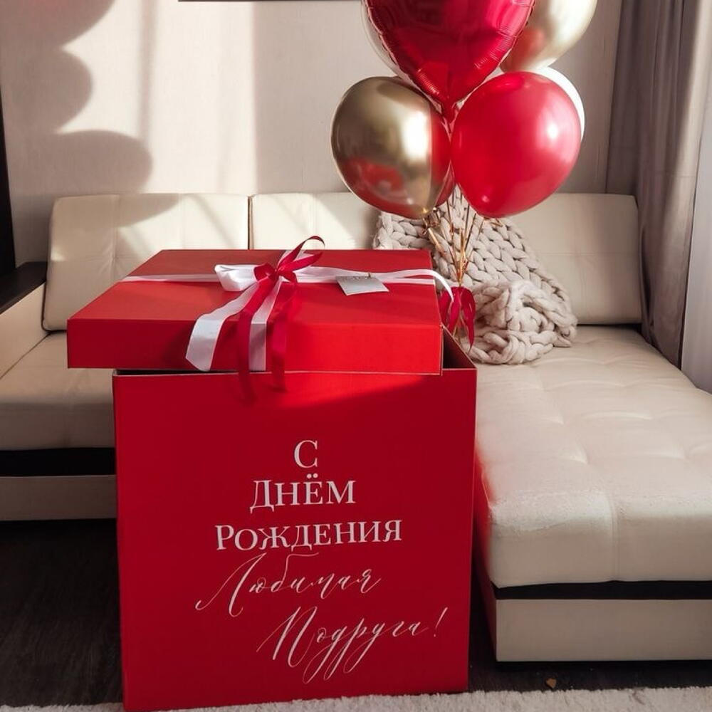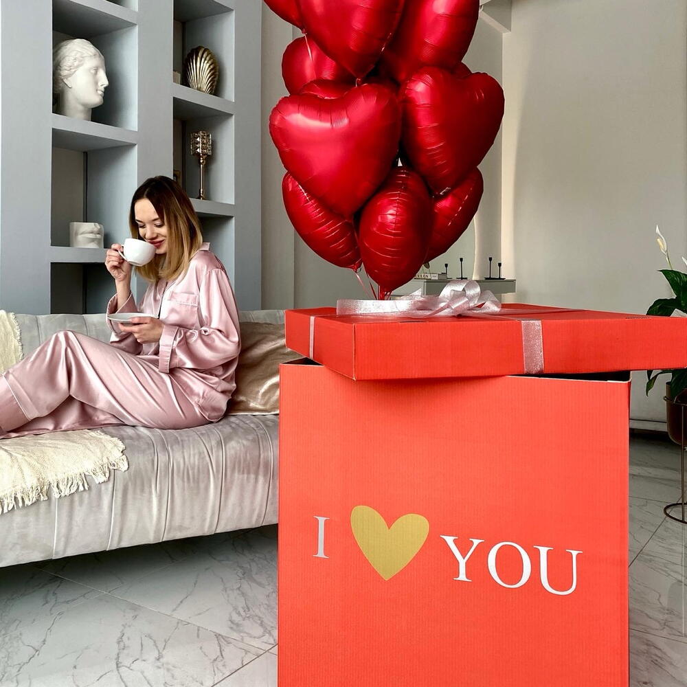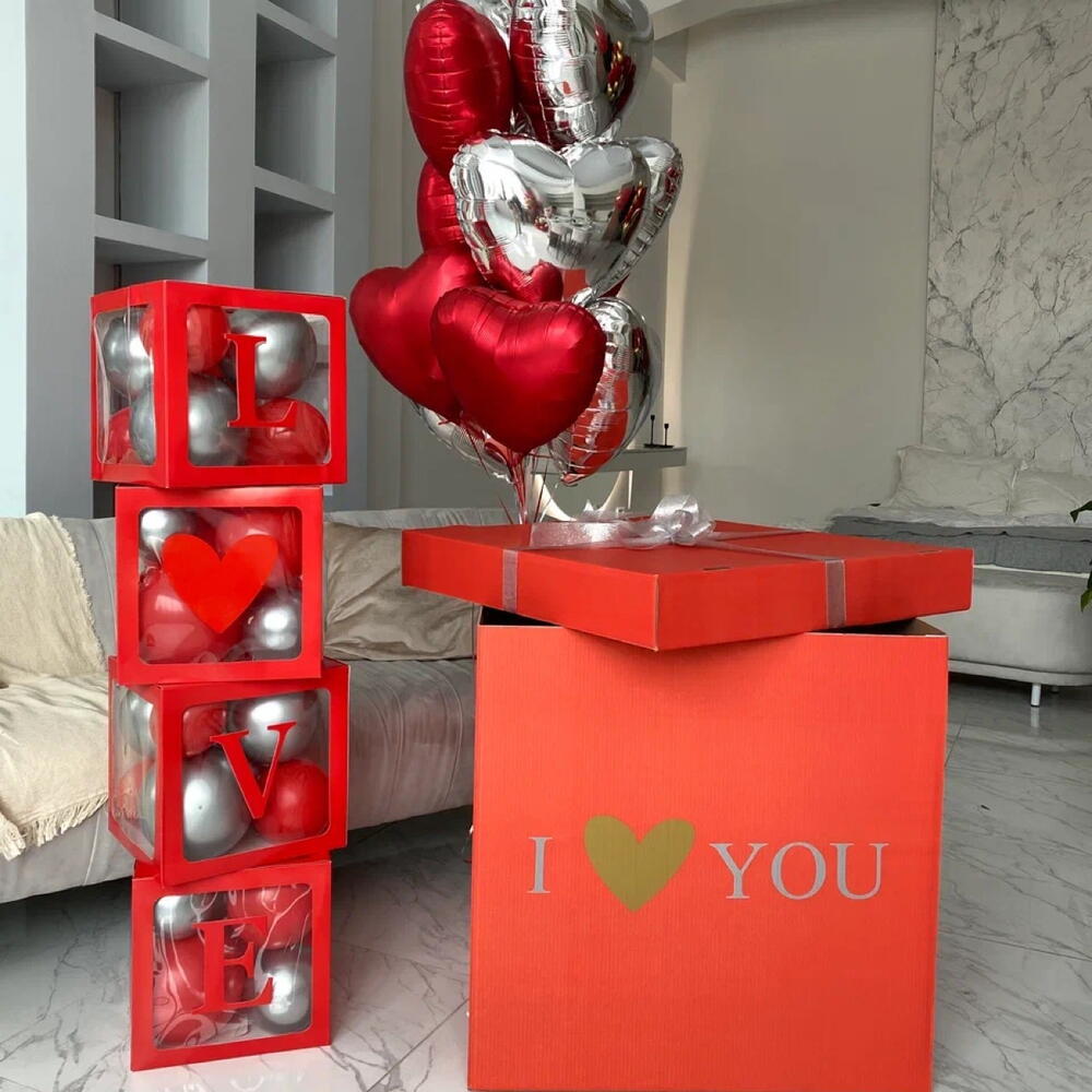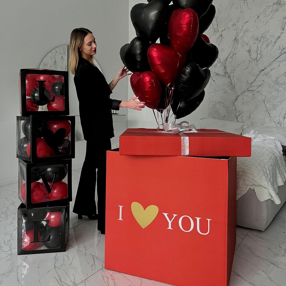 red color, size is 70*70*70 , including 10-12 helium balloons of your choice, bow and text