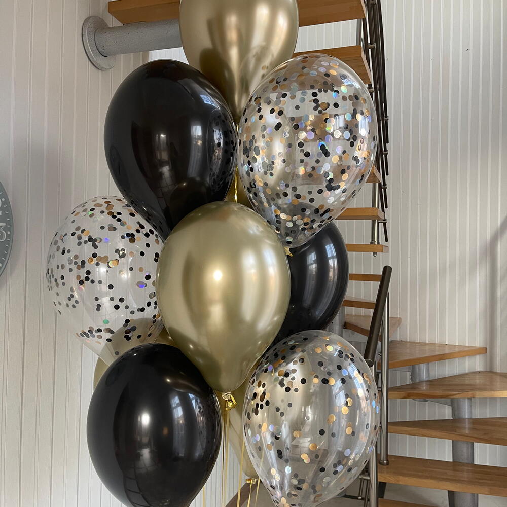 Included in the set: 1 bouquet of 12 balloons ( 4 balloons 30cm chrome, 3 balloons 30cm with confetti, 5 balloons 30cm pastel) 1 weight 1 bag for transportation Total number of balloons: 12 Filling: All balloons filled with helium длина, мм: 2000 ширина, мм: 2000 высота, мм: 2000