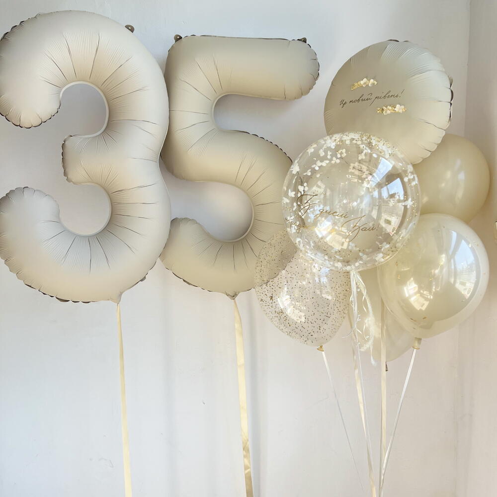 Нежен премиум сет в спокойни кремаво-бежови тонове. Включва: • две бежови цифри — може да изберете всеки номинал • фолий балон в бежово с персонализация и декор • бабълс 35 см с хортензия и персонален надпис • два стъклени double-stuff балона с бежова потал • два матови бежови балона • един прозрачен балон със златни конфети • три стилни тежести Елегантен, топъл и изчистен комплект в бежова премиум визия.