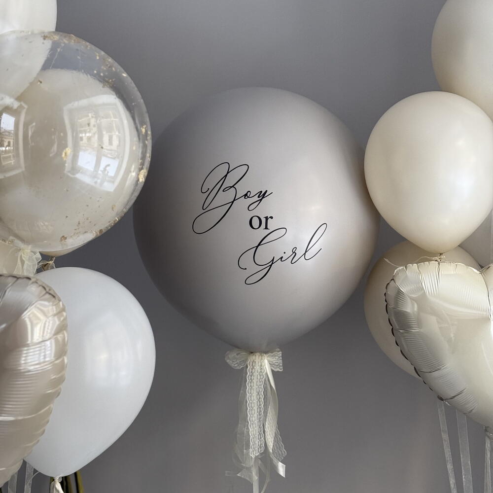 Included in the set: 1 gender reveal balloon 60cm with custom inscription 2 bouquets of 8 balloons each (each includes: 1 heart 45cm , 1 bubble 50cm with gold leaf, 6 balloons 30cm pastel) 3 weights 3 bags for transportation Total number of balloons: 17 Filling: All balloons with helium длина, мм: 2000 ширина, мм: 2000 высота, мм: 2000