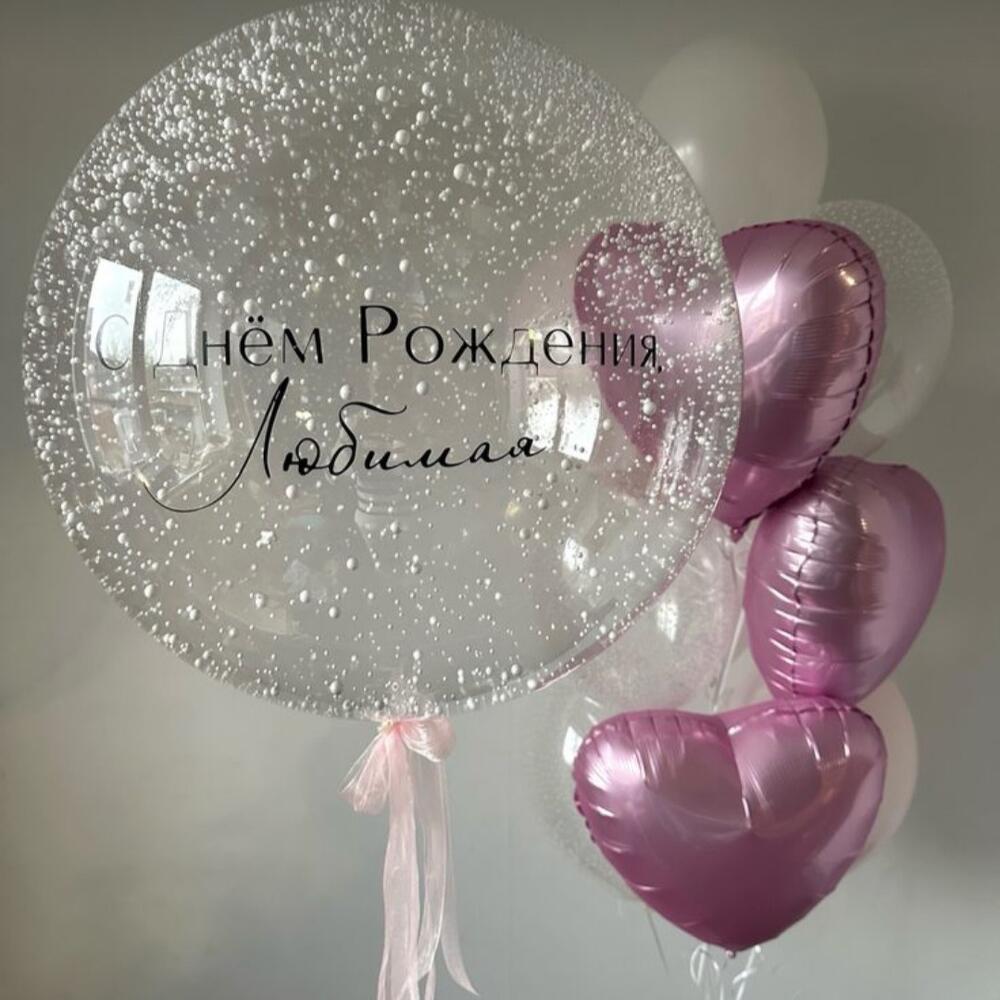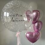 Big transparent balloon with text (russian, english or serbian), 3 foil hearts, 7 latex balloons