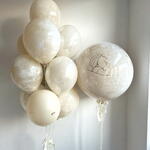 Елегантен и обемен комплект в бежово-златна гама, който създава цялостна визия за изписване и изпълва пространството с уют и празнично настроение. Подходящ за фотозона и красива среща на бебето. Размерът на комплекта може да бъде намален или увеличен — цената се преизчислява индивидуално. Просто ни пишете и ще направим всичко. Състав: – голяма мраморна сфера с персонализация – фолиево облаче – букет от 10 балона: • дабъл стаф (мрамор / със златна патина) • базови балони в цветовете на композицията