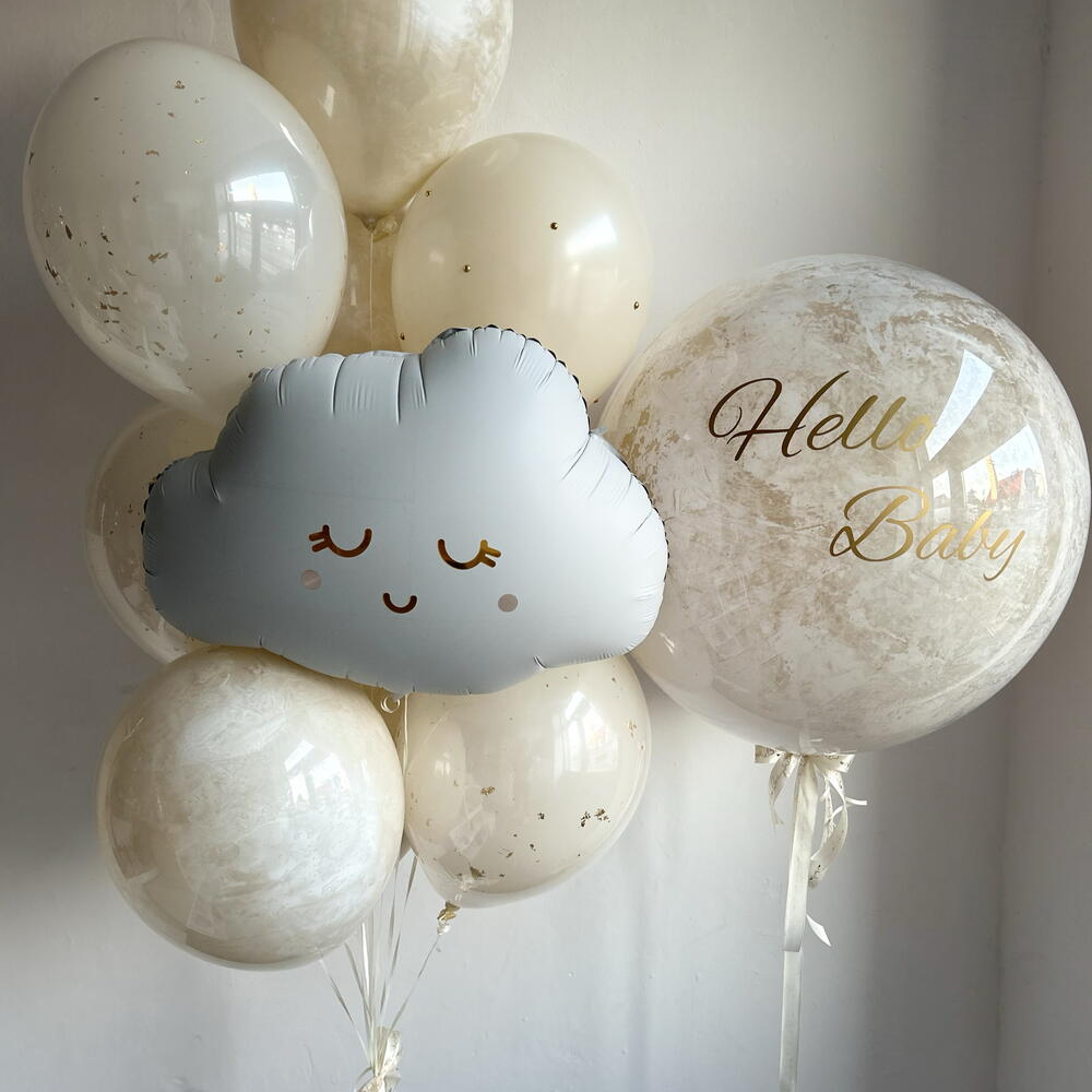 Елегантен и обемен комплект в бежово-златна гама, който създава цялостна визия за изписване и изпълва пространството с уют и празнично настроение. Подходящ за фотозона и красива среща на бебето. Размерът на комплекта може да бъде намален или увеличен — цената се преизчислява индивидуално. Просто ни пишете и ще направим всичко. Състав: – голяма мраморна сфера с персонализация – фолиево облаче – букет от 10 балона: • дабъл стаф (мрамор / със златна патина) • базови балони в цветовете на композицията