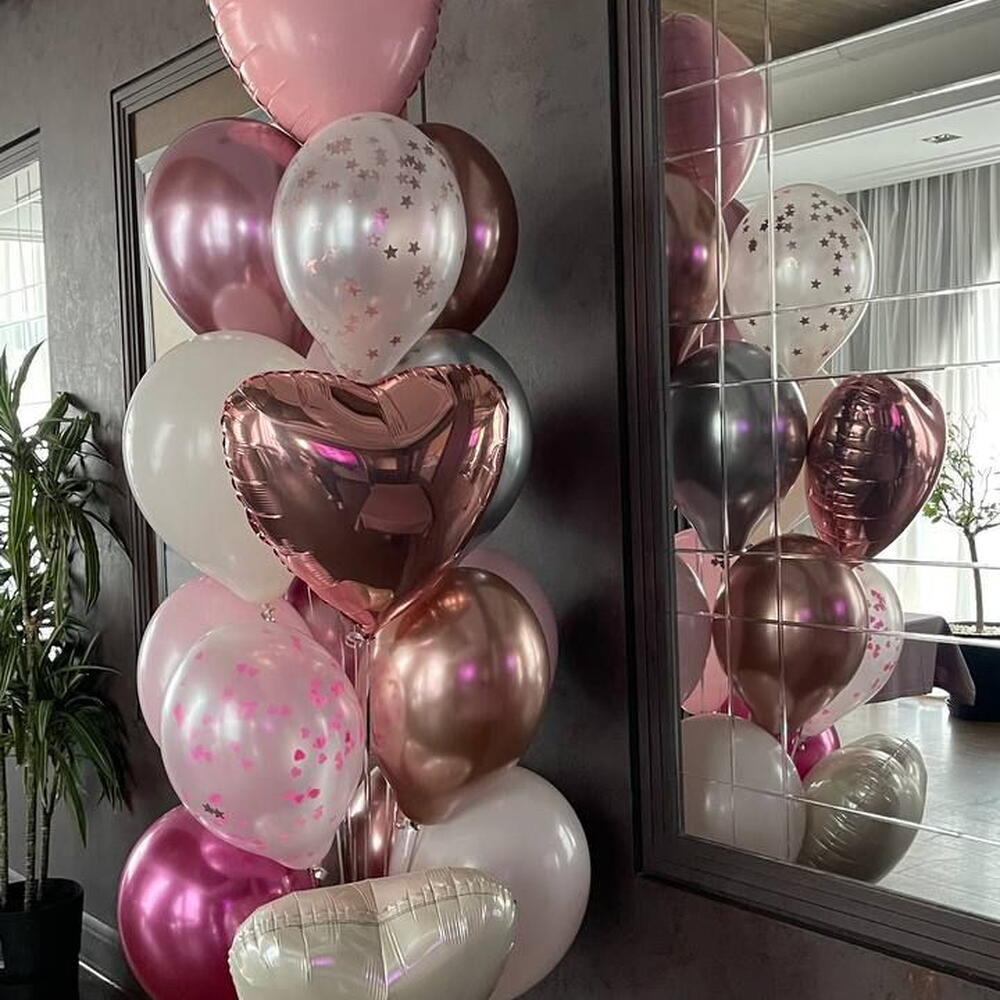 Included in the set: 1 bouquet of 16 balloons ( 3 hearts 45cm, 7 balloons 30cm chrome, 3 balloons 30cm with confetti, 3 balloons 30cm pastel) 1 weight 1 bag for transportation Total number of balloons: 16 Filling: All balloons with helium длина, мм: 2000 ширина, мм: 2000 высота, мм: 2000