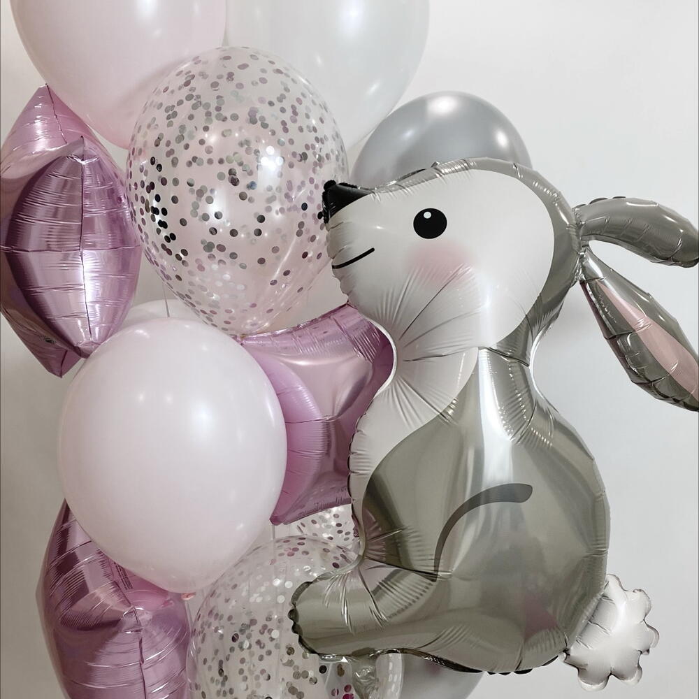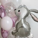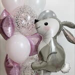 The composition consists of 7 latex balloons, three stars or hearts and a large bunny figure