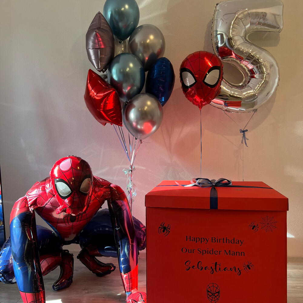 The set includes: Number balloon 1 standing figure: Spider-Man 1 figure: Spider-Man mask 1 cluster of 10 balloons (2 stars 45 cm, 1 heart 45 cm, 7 balloons 30 cm chrome ) box with bow and inscription 3 weights 2 bags for transportation Total number of balloons: 13 Filling: All balloons with helium длина, мм: 2000 ширина, мм: 2000 высота, мм: 2000