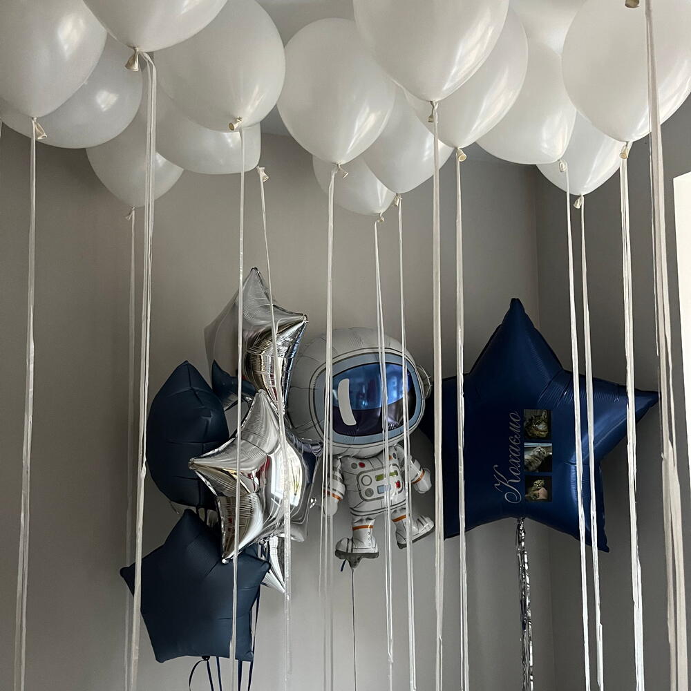 Included in the set: 1 figure: astronaut 1 star 90cm with inscription and photos 1 bundle of 5 stars 45cm 15 balloons 30cm pastel ceiling balloons with rain tassels 3 weights 3 bags for transportation Total number of balloons: 22 Filling: All balloons are filled with helium. длина, мм: 2000 ширина, мм: 2000 высота, мм: 2000