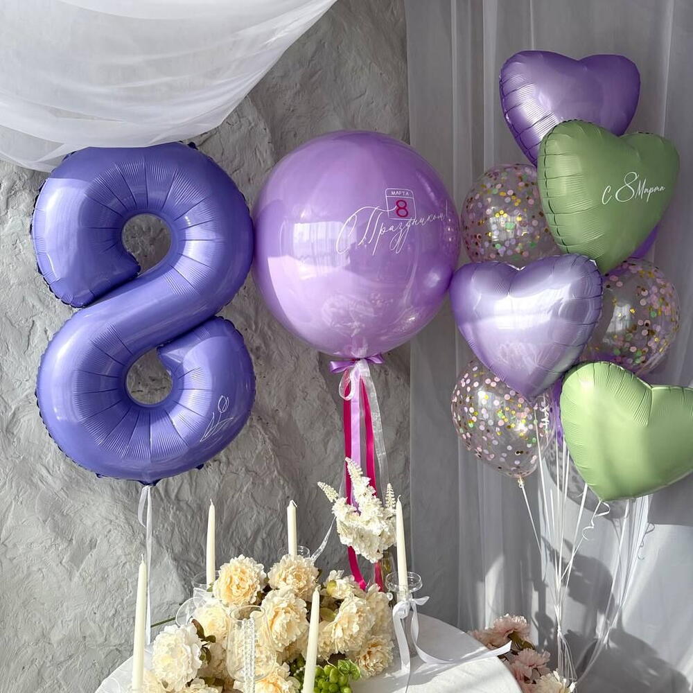 Included in the set: Number 1 crystal balloon 70 cm with inscription «Happy Holidays!» 1 bouquet: 2 hearts 45 cm , 2 hearts 45 cm with inscription «Happy March 8», 3 balloons 30 cm pastel, 3 balloons 30 cm with confetti) 3 weights 2 bags for transportation Total number of balloons: 12 Filling: All balloons are helium-filled длина, мм: 2000 ширина, мм: 2000 высота, мм: 2000