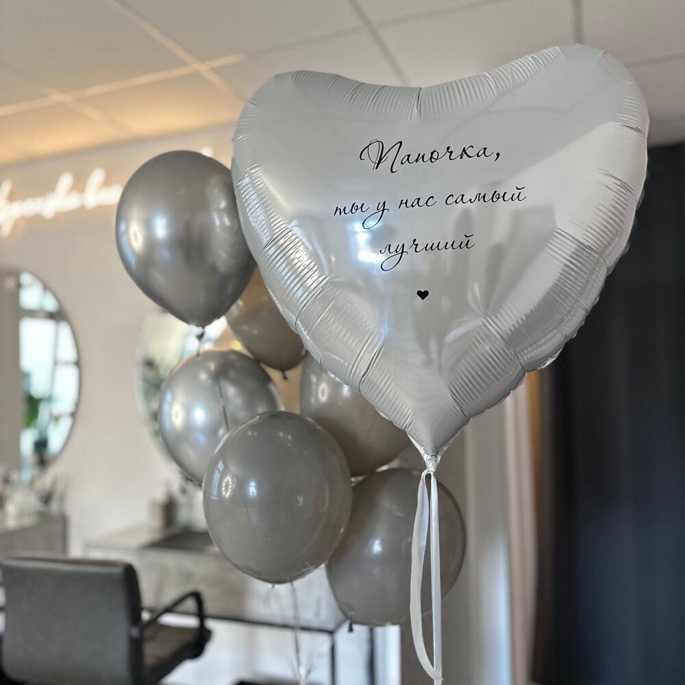 The set includes: 1 heart 90 cm with inscription 1 cluster of 8 balloons ( 3 balloons 30 cm chrome, 5 balloons 30 cm pastel) 2 weights 2 bags for transportation Total number of balloons: 9 Filling: All balloons with helium длина, мм: 2000 ширина, мм: 2000 высота, мм: 2000