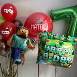 Included in the set: Number 1 figure: Steve 1 figure: happy birthday square 1 crystal balloon 70cm with a custom inscription and sticker 1 bundle of 7 balloons ( 3 balloons 30cm with print, 2 balloons 30cm chrome, 2 balloons 30cm pastel) 5 weights 3 bags for transportation Total number of balloons: 11 Filling: All balloons are filled with helium. длина, мм: 2000 ширина, мм: 2000 высота, мм: 2000