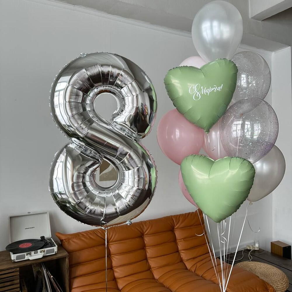 Set includes: Number 1 balloon bouquet: 2 hearts 45 cm (one with the inscription "Happy March 8th!"), 4 balloons 30 cm pastel, 2 balloons 30 cm with confetti, 2 balloons 30 cm metallic 2 hearts 45 cm metallic (one with the inscription "Happy March 8th!") 2 weights 2 bags for transportation Total number of balloons: 11 Filling: All balloons with helium длина, мм: 2000 ширина, мм: 2000 высота, мм: 2000