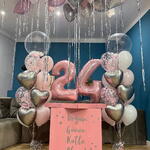Included in the set: Number Box with inscription and stickers Inside the box - ceiling-floating balloons with tinsel: 4 hearts 45cm , 5 stars 45cm , 20 mini balloons (float up to 8 hours) 2 clusters of 16 balloons (each: 3 hearts 45cm , bubble ball 60cm with feathers, 3 balloons 30cm with confetti, 9 balloons 30cm pastel) 4 weights 3 bags for transportation Total number of balloons: 62 Filling: All balloons with helium длина, мм: 2000 ширина, мм: 2000 высота, мм: 2000