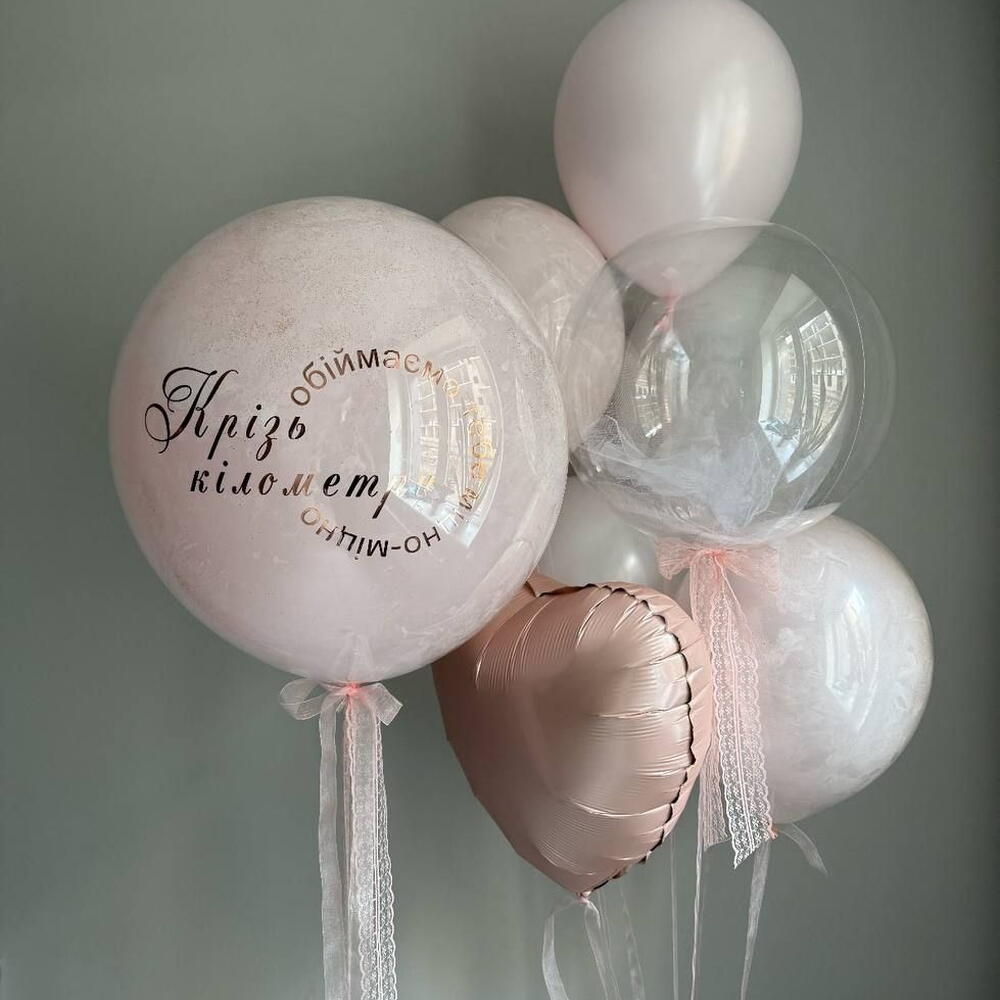 Included in the set: 1 crystal balloon 70cm with a custom inscription 1 bundle of 7 balloons ( 1 heart 45cm , 1 bubble 50cm with foam beads and tulle, 3 balloons 30cm pastel, 2 balloons 30cm crystal) 2 weights 2 bags for transportation Total number of balloons: 8 Filling: All balloons are filled with helium длина, мм: 2000 ширина, мм: 2000 высота, мм: 2000