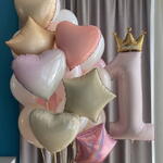 Included in the set: Number with crown 1 bouquet of 20 balloons ( 4 hearts 45cm , 3 stars 45cm , 13 balloons 30cm pastel) 2 weights 2 bags for transportation Total number of balloons: 21 Filling: All balloons with helium длина, мм: 2000 ширина, мм: 2000 высота, мм: 2000